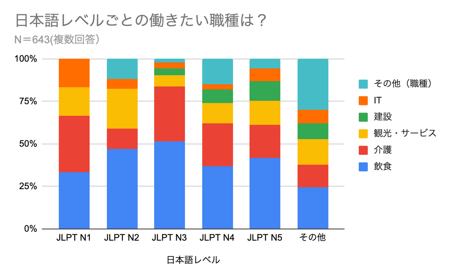日本語レベル別に希望職種を分析した結果、初級レベル(JLPT N4・N5)では、飲食や介護といった日本語初級でも就労しやすいサービス業で働きたい意向がわかりました。