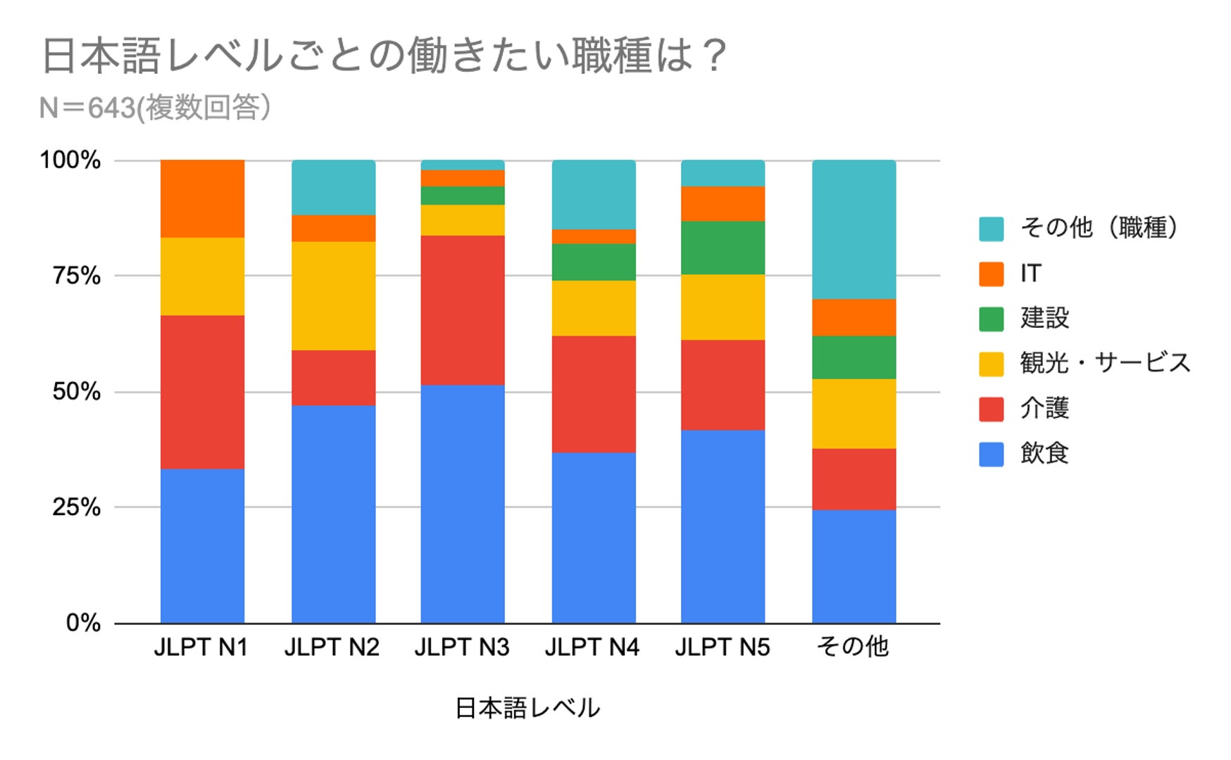 一方で、中級レベル(JLPT N3)になると、観光・サービスなど職種の幅が広がり、さらに上級レベル(JLPT N1・N2)では、観光やITなど、より高度な日本語力を活かせる職種への関心が高まる傾向が見られました。日本語レベルの向上に伴い、就労分野の選択肢が段階的に広がっていく傾向が確認されました。