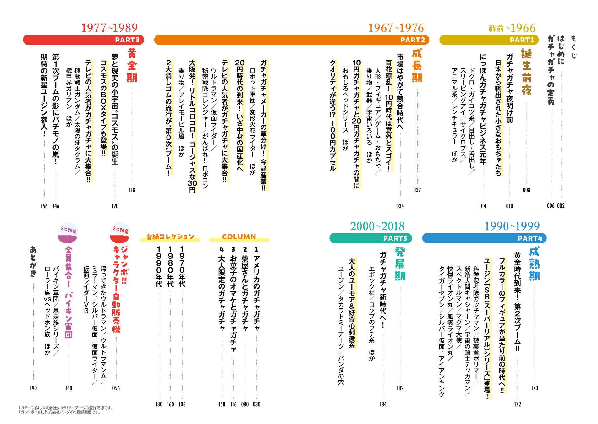 「ガチャガチャ」と呼ばれるカプセルトイの誕生から昨今の大ブームに至るまでの歴史を総まとめする年代記(クロニクル)。本書では、日本におけるガチャ誕生期(1960年代)から黄金時代(〜80年代)を中心に、ガチャガチャ研究の第一人者である著者の一大コレクションの中から選りすぐりのアイテムを圧倒的な物量で掲載。カプセルの中身の玩具はもちろんのこと、購買欲を高める台紙、コレクション欲をかきたてるミニブック、筐体やカプセルの変遷などバラエティ豊かに紹介しています。一般社団法人日本ガチャガチャ協会(小野尾勝彦会長)の全面協力のもと、貴重な資料なども多数ご提供頂き、我が国独自のガチャガチャ文化について多角的に振り返る、過去に類を見ないような一冊です。