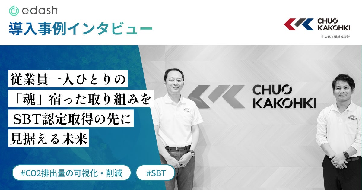 CO2排出量可視化・削減サービスプラットフォーム「e-dash」を提供するe-dash株式会社(本社:東京都港区、代表取締役社長:山崎冬馬、読み:イーダッシュ、以下「当社」)は、振動エネルギーを活用した粉砕機・乾燥機の製造で国内トップシェアを占める中央化工機株式会社(所在地:愛知県豊明市、代表取締役社長:加藤 寿紀、以下「中央化工機」)に「e-dash」導入の背景や中小企業版SBT(Science Based Targets)認定を取得した狙い・効果などを聞くインタビューを実施しました。この度、本インタビュー記事を当社ウェブサイトに掲載したことをお知らせします。