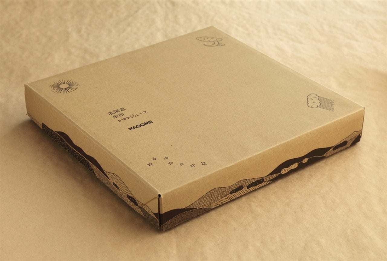 「北海道余市トマトジュース」は、トマトの定植や収穫作業を障がいを持つ方の雇用機会にするため、北海道余市町の生産者水尻さんとカゴメが二人三脚で作り上げたトマトジュースです。「トマト栽培で障がいを持つ方と地域の農業を元気にしたい」という思いが詰まっております。化粧箱の外周には、余市町の魅力を存分に伝えるため、水尻農園の近くにある高台から余市町を360度見渡した風景を描いております。原料となるトマトは、当社が10 年がかりで開発した「爽果(さやか)」を使用しており、青臭みが少なく、酸味と甘みの絶妙なバランスが特徴です。非常にデリケートなこのトマトは、皮が薄く割れやすい為、水尻さんが日々畑の様子を見ながら生育状況を見守り、最適なタイミングで丁寧な手収穫を行っています。