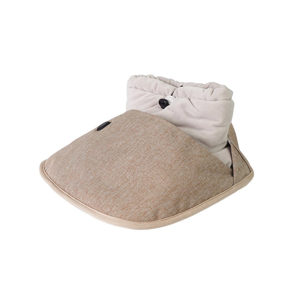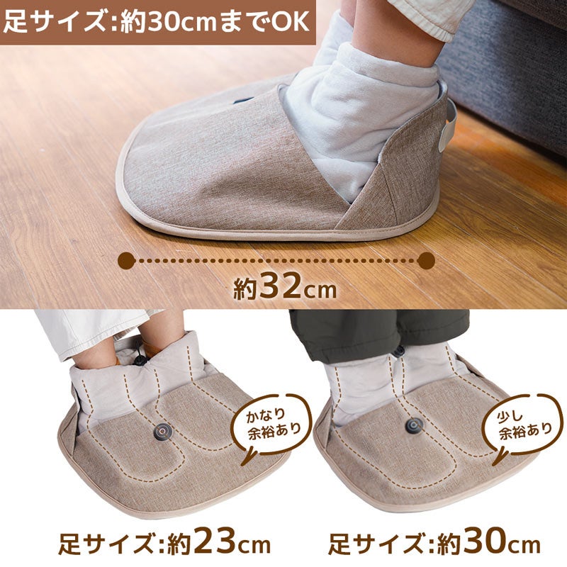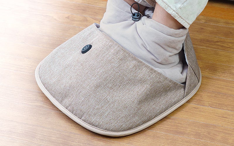 本体サイズは幅34×奥行32×高さ20cm、重さ約300g。取っ手部分を引っ掛けて収納したり、折りたたんで収納も可能。使い方は両方の足を本体内に入れて、電源ボタンを押せば足裏の2か所のヒーターが足を温めます。足首まですっぽりと包み込み、さらにドローコードを締めれば内部の暖かい空気を逃がさず暖かい状態を維持できます。