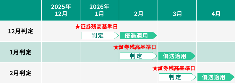 毎月の最終営業日時点の対象証券残高の合計(日本株・米国株・投資信託)を基準に翌々月のランクを決定し、優遇金利を適用します。