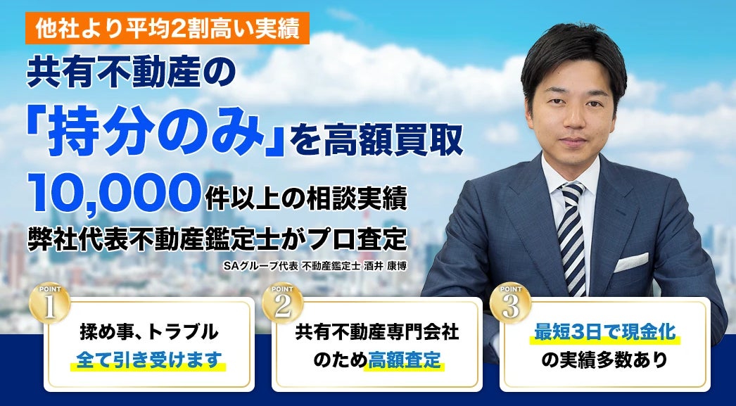 株式会社SAは、不動産の共有不動産(共有持分/共有名義)の解決、空き家や再建築不可物件の再生、借地権・底地の権利整理など、複雑な案件に特化した事業を展開しています。創業以来、10,000件以上の相談実績、1,000件以上の売買実績を誇り、国土交通省から登録講習機関として認定されるなど、高い信頼性を提供しています。