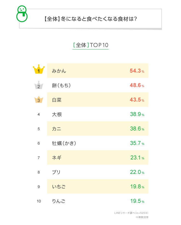 【LINEリサーチ】冬になると食べたくなる食材1位は「みかん」、2位は「餅」