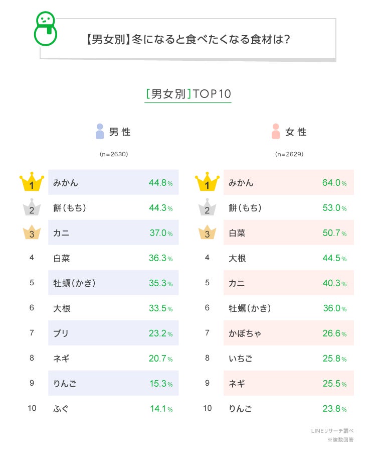 「みかん」「餅(もち)」が男女ともに1位、2位に