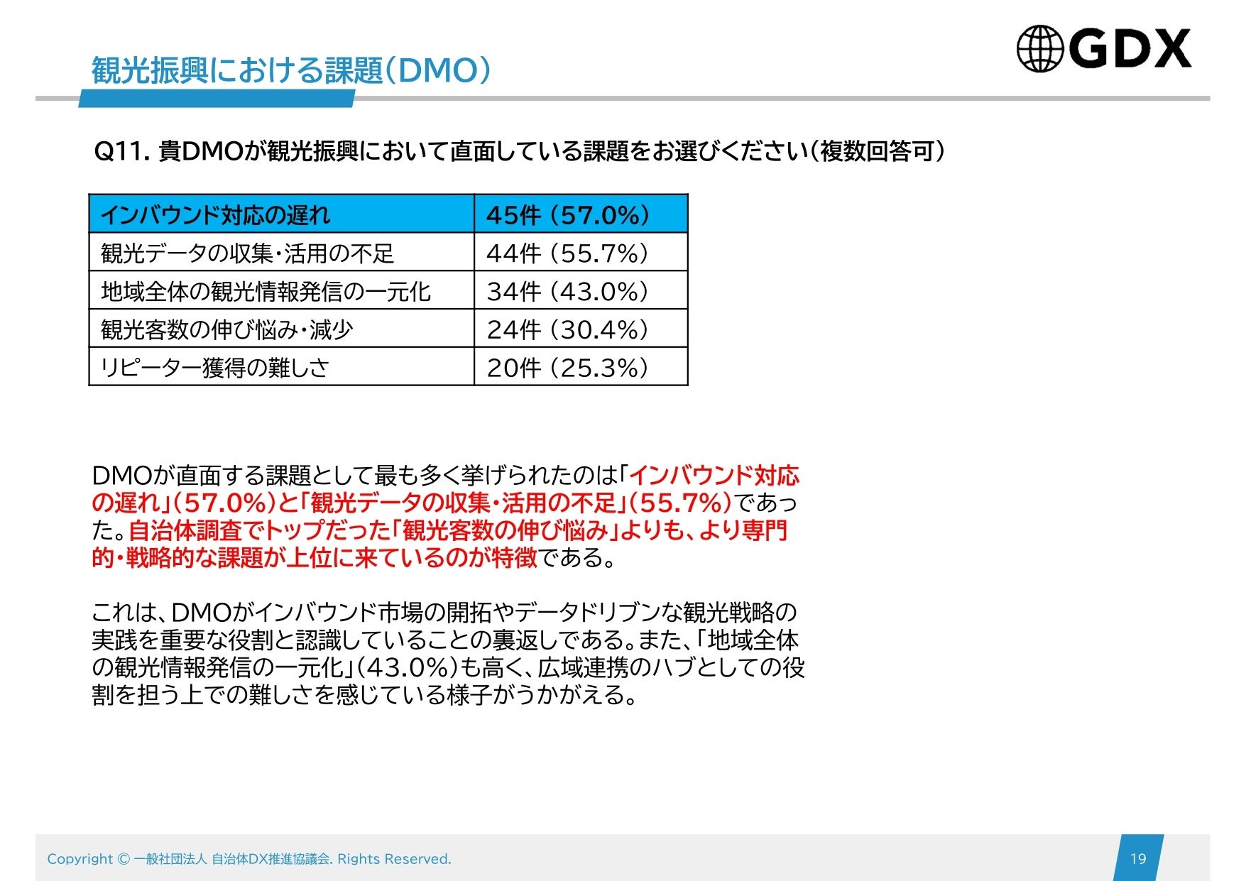 約半数の自治体が「客数」という目に見える結果に課題を感じる一方、DMOはより専門的・戦略的な「インバウンド対応」や「データ活用」に課題を見出しており、それぞれの役割の違いが結果に表れています 。