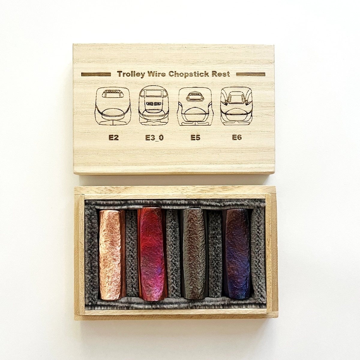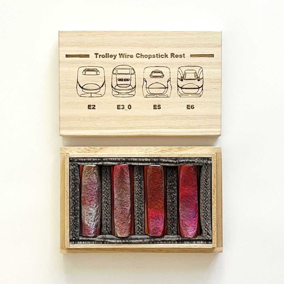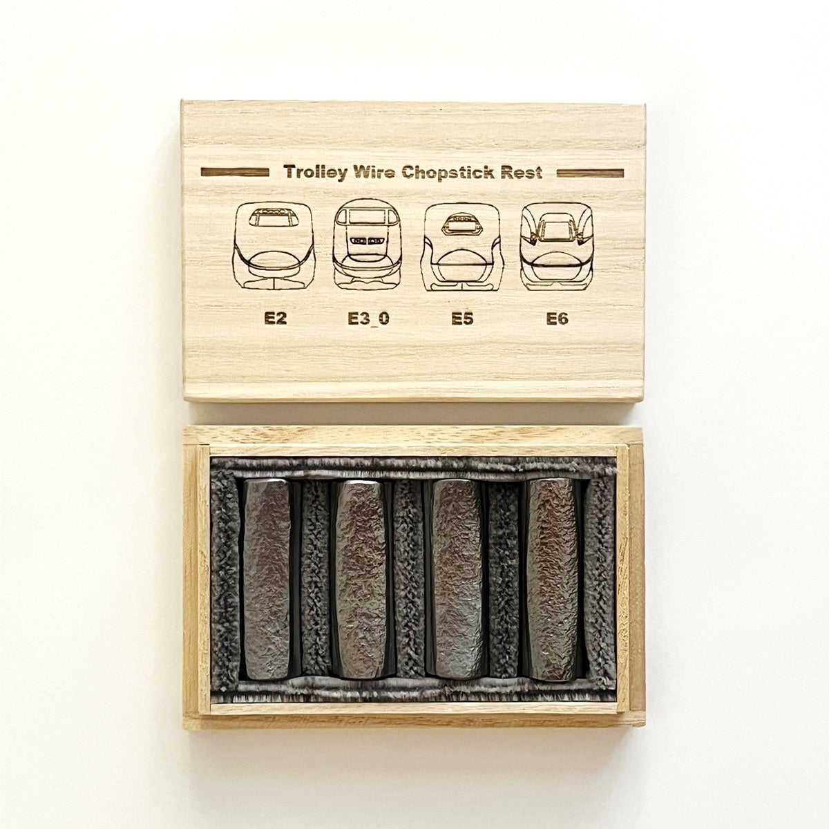 「東北新幹線トロリ線箸置き」は、東北新幹線古川~仙台間を実際に走行していたE2系・E3系0番代・E5系・E6系車両のオリジナルデザインの刻印を施し、E5系新幹線座席シートを敷いた特別仕様の桐箱でお届けします。