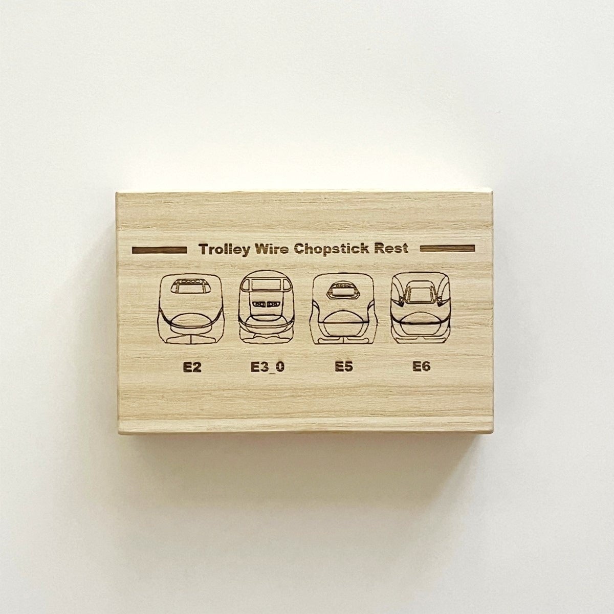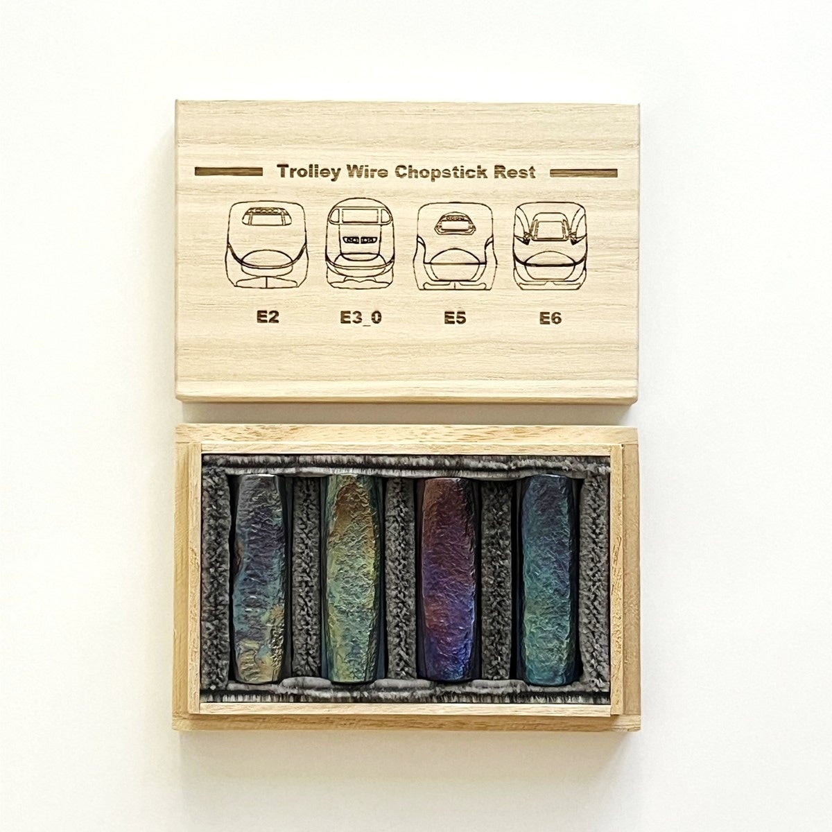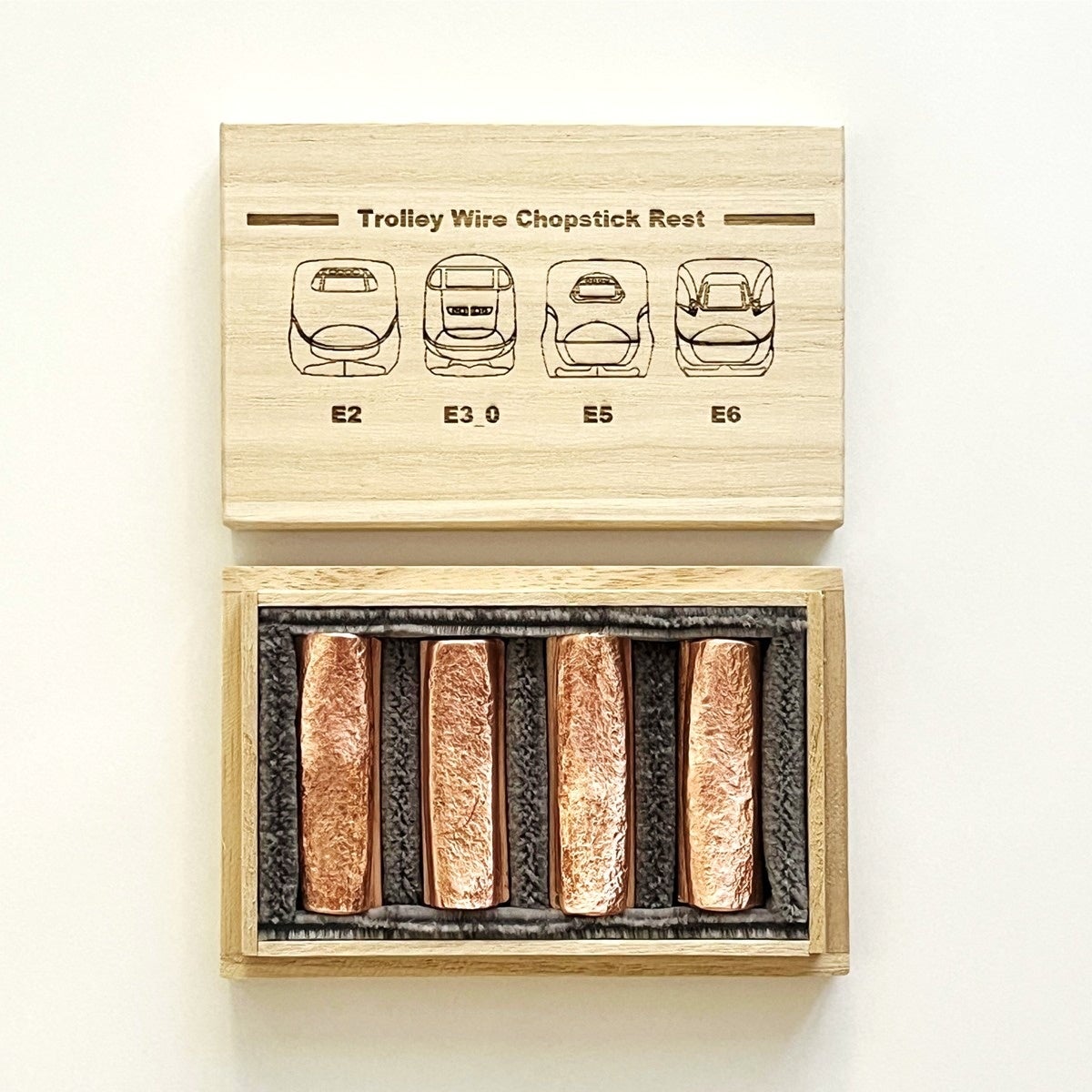 「東北新幹線トロリ線箸置き」は、東北新幹線古川~仙台間を実際に走行していたE2系・E3系0番代・E5系・E6系車両のオリジナルデザインの刻印を施し、E5系新幹線座席シートを敷いた特別仕様の桐箱でお届けします。
