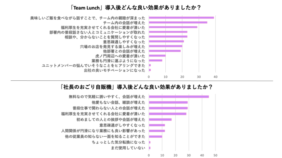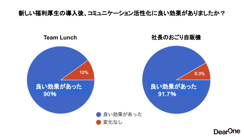 また、上記2点の導入後従業員アンケートを行った結果、コミュニケーションの活性化に良い効果があったと答えた割合が、「Team Lunch」「社長のおごり自販機」共に90%超という結果となりました。