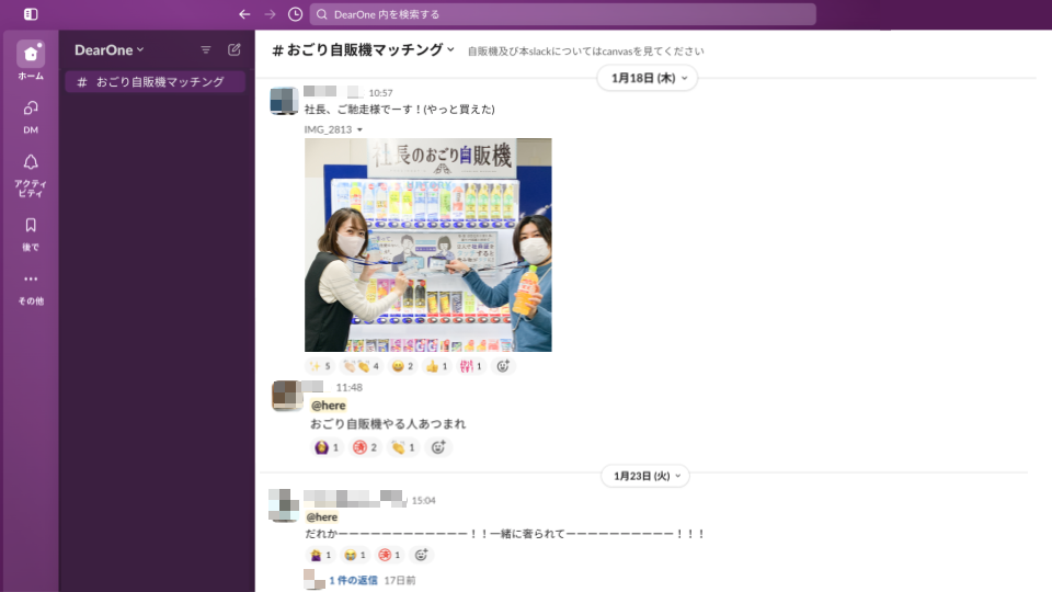 DearOneでは、利用する際にペアが見つからない場合等、自販機前集合の呼び出しができるSlackチャンネルが発足しました。他部署の従業員同士の「はじめまして」の挨拶や、社長に「ごちそう様です!」と言った呼びかけなど、フランクなコミュニケーションが増加しています。