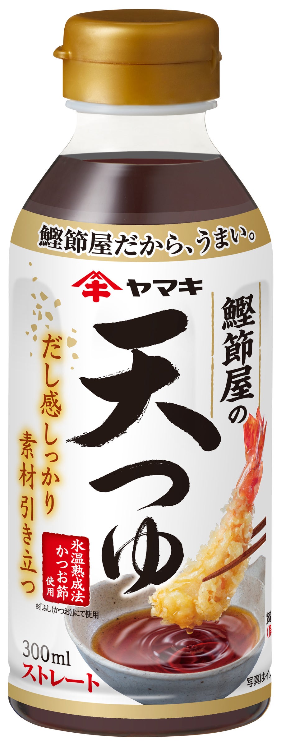 ヤマキ株式会社(本社:愛媛県伊予市 代表取締役社長:城戸善浩、以下 ヤマキ)は、「ちょっと贅沢な匠のだし天つゆ300ml」を10年ぶりにリニューアルし、「鰹節屋の天つゆ300ml」として新たに発売いたします。今回のリニューアルでは、鰹節屋だからできる味を追求し、だし感をアップさせる品質改訂を行いました。また、パッケージ改訂も行い「鰹節屋だから、うまい。」をキャッチコピーとし、鰹節屋・だし屋としてのこだわりを訴求するデザインに仕上げています。