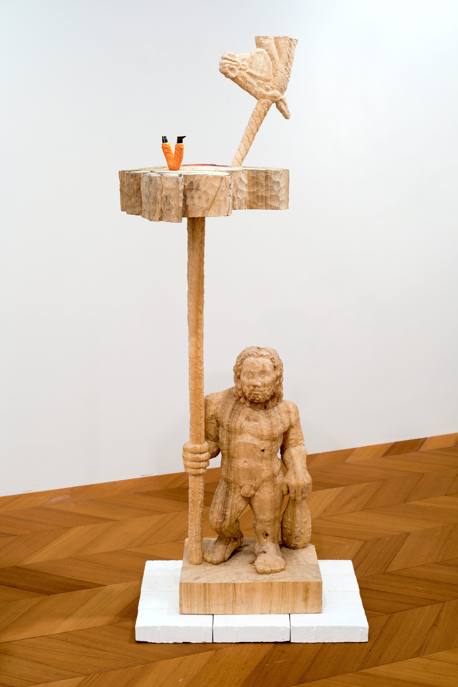 彫刻家の丸山太郎氏は木材、羽、ソフビなどのフィギュア、鉄柱など様々な素材を組み合わせた作品を制作。使用する素材の多様性同様、制作のモチベーションとなっているのは、雑多な日常から触れる様々な視覚的、感情的、感覚的な情報であり、それらを組み替え、再構築することによって全く違う像を作り上げています。