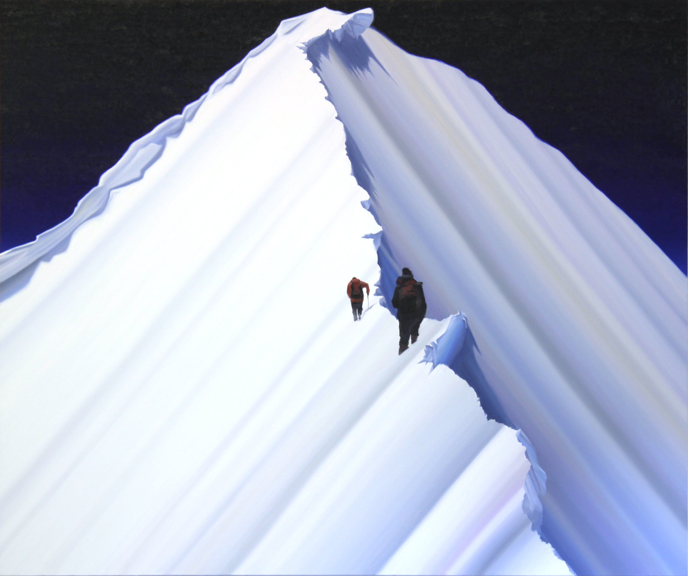 加茂昂氏は3.11以降の現状、特に福島での状況を多くのフィールドワークを通して、作品を制作。今回、AMATEURで展示する作品も山に挑む登山家、人間が酸素ボンベなしで挑める限界点をメタファーとして、震災後の日本を描いている2010年代末の作品になります。