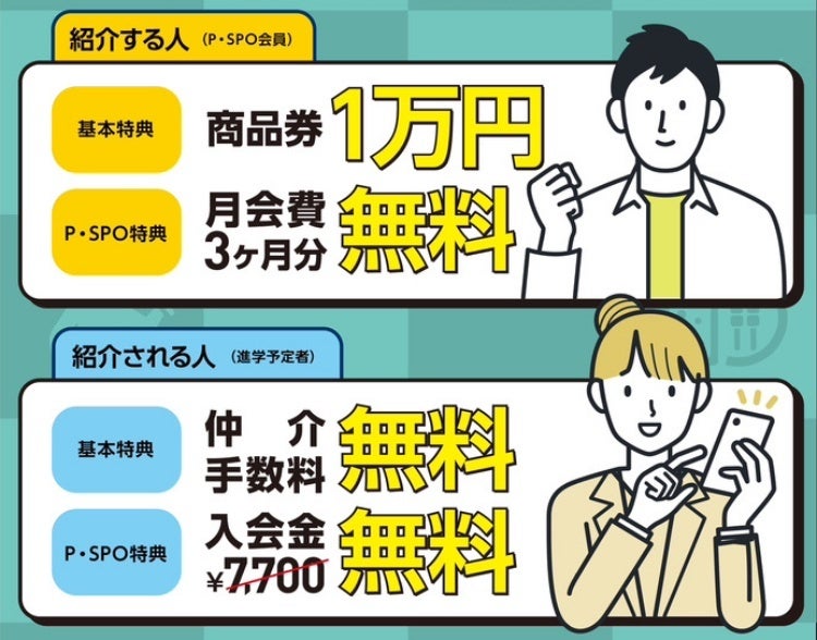 P・SPO会員の方が学生さん(進学予定者)を三福綜合不動産のアパマンショップへご紹介いただくと、基本特典として【商品券 1万円分】をプレゼント!