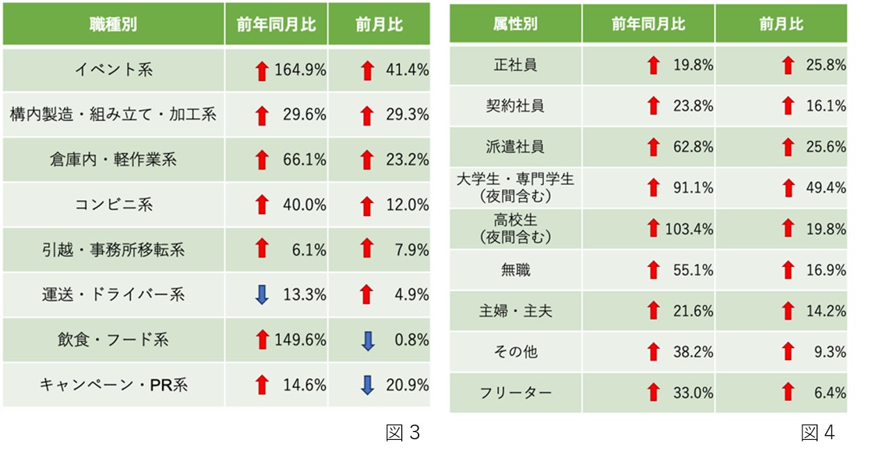 前年同月比で最も増加率が大きかったのは「イベント系」で、+164.9%となっており、ついで「飲食・フード系」、「倉庫内・軽作業系」となっています。