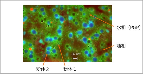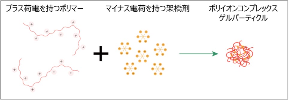 本処方は、水溶液中で多くのプラス電荷を持つポリマーを、マイナス電荷を持つ架橋剤で結合したポリイオンコンプレックスゲルパーティクル(図1)を基剤としています。そこにUVフィルターやそれらを溶かす油剤、感触やUVの散乱を調整するための粉体などを加え、油の中に水滴が存在する油中水型のエマルションという形態の日焼け止めを作製しました。