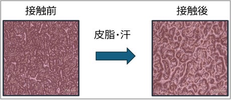 この処方は、同じ量のUVフィルターを含むPGPを用いない既存の油中水型エマルション処方に比べ、高いUV吸収能を示すことがわかりました。これは粉体がPGPの3次元構造中に均一に分散することによってその効果を十分に発揮するためと考えています(図2)。また、この処方が形成する皮膜は、微細な凹凸を自発的に形成し、光を散乱することによって優れたテカリ防止効果を発揮します。汗/皮脂に接触するとこの構造が強調されるので、効果の増強と持続が期待できます(図3右)。更に、この皮膜は自己修復能(図4)を持ち、こすれなどによる破断にも耐性を備えていると考えられます。この処方は油分を多く含む組成にもかかわらず、使用試験においてもさっぱりとした軽いつけ心地が高い評価を得ています*。