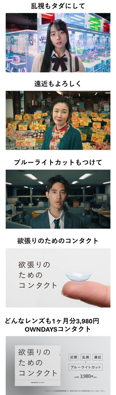 メインコピーである「欲張りのためのコンタクト」は、シンプルさ、わかりやすさ、伝わりやすさを追求しました。 お客様のニーズが多様化する現代において、乱視用や遠近両用のコンタクトレンズなど「どんな見え方でも、一律料金」というOWNDAYSコンタクトの強みを武器に、これまでの複雑な料金体系や購入の分かりにくさを解消したいという思いを込めています。
