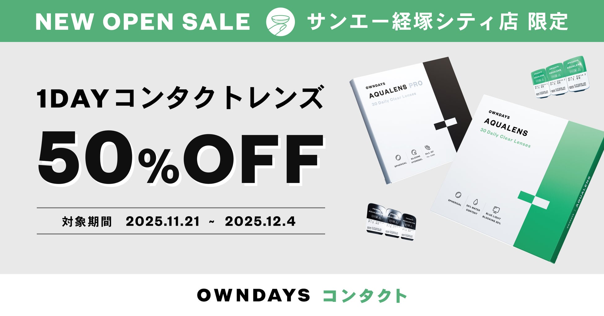 内容: オープン記念として、対象のコンタクトレンズ(OWNDAYS AQUALENS、OWNDAYS AQUALENS PRO)を各種2箱まで半額でご提供します。