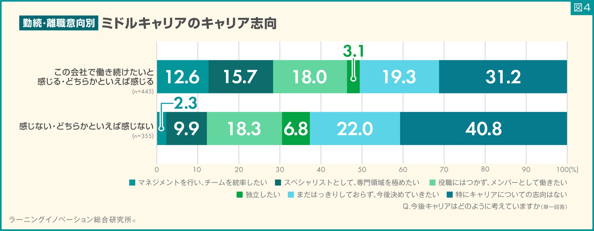 4. 勤続意向のある人は「マネジメント志向」「スペシャリスト志向」が高く、計約3割が回答、離職意向のある人は「キャリア志向がない・未定」と約6割超が回答