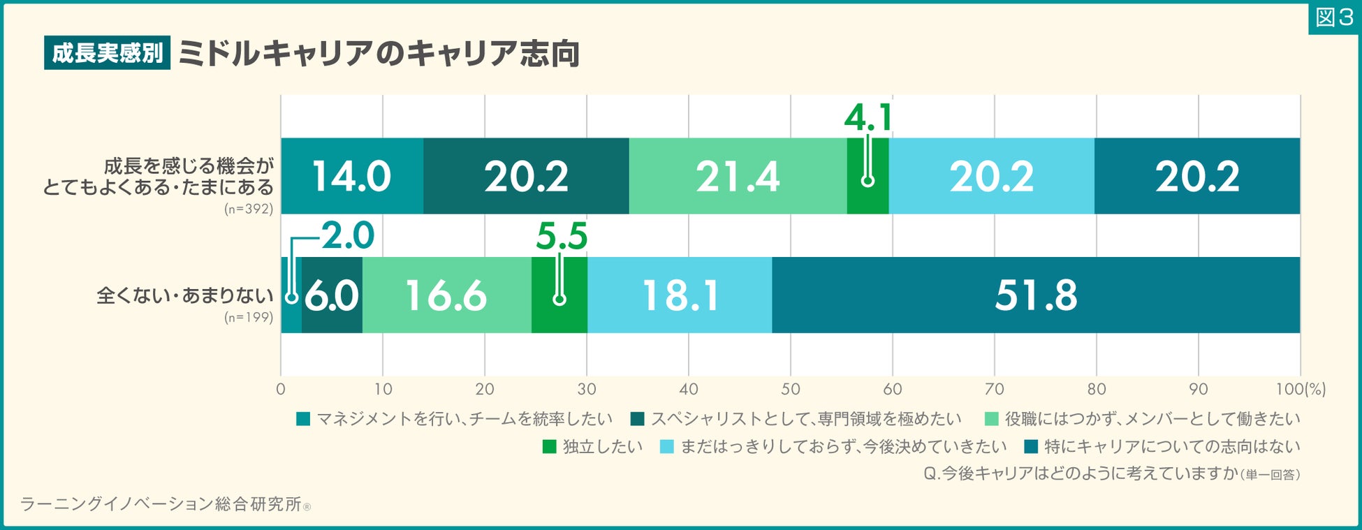 3. 成長実感の機会が多いミドルキャリアは「マネジメント・スペシャリスト志向」が高く、成長実感の機会が少ないミドルキャリアは「キャリア志向がない・未定」が高い
