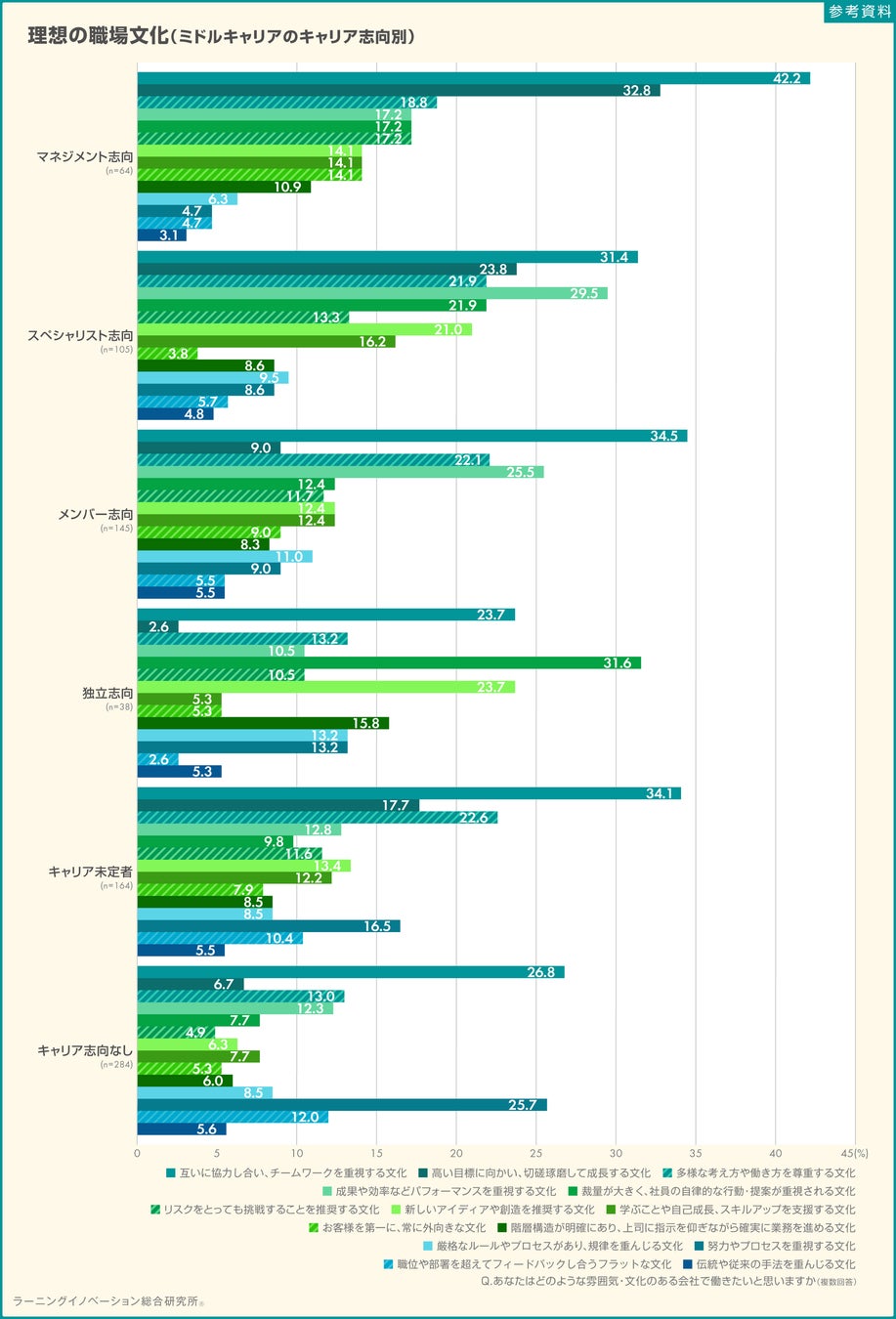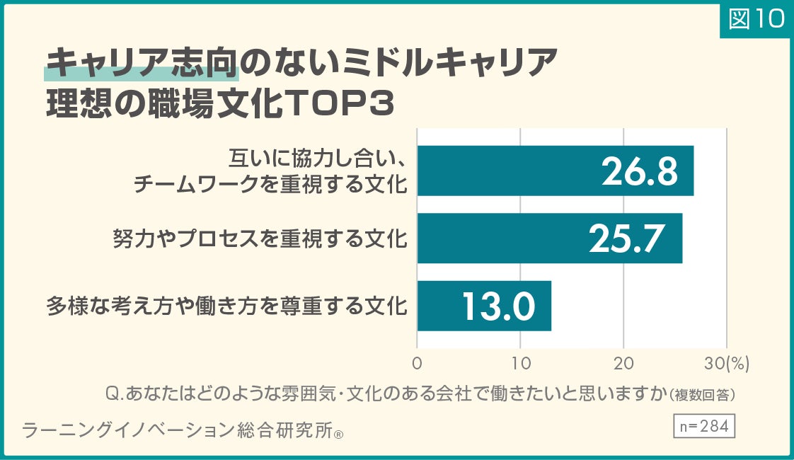 キャリアについての志向がないミドルキャリアの理想は、「互いに協力し合い、チームワークを重視する文化」が26.8%と最大の割合となりました。次に「努力やプロセスを重視する文化」が25.7%と続き、他の群より突出した結果となりました。(図10)