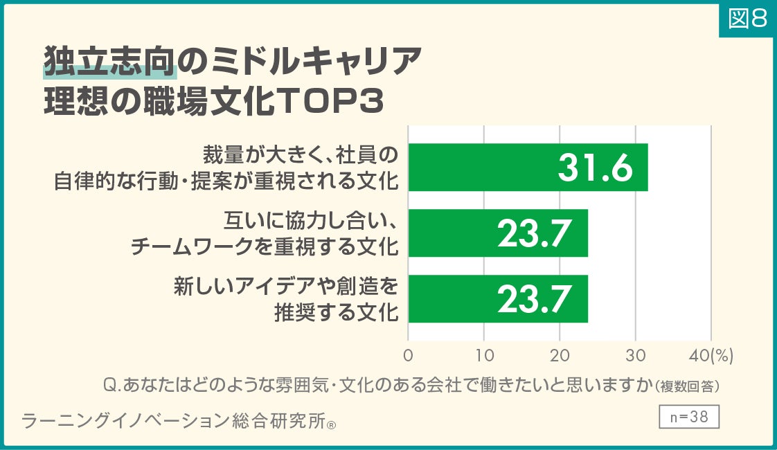 将来、独立をしたいと考えているミドルキャリアは、「裁量が大きく、社員の自律的な行動・提案が重視される文化」が31.6%と最大の割合となり、他の群よりも突出しました。3位となった「新しいアイディアや創造を推奨する文化」(23.7%)は、他の群と比べて高い割合となりました。(図8)