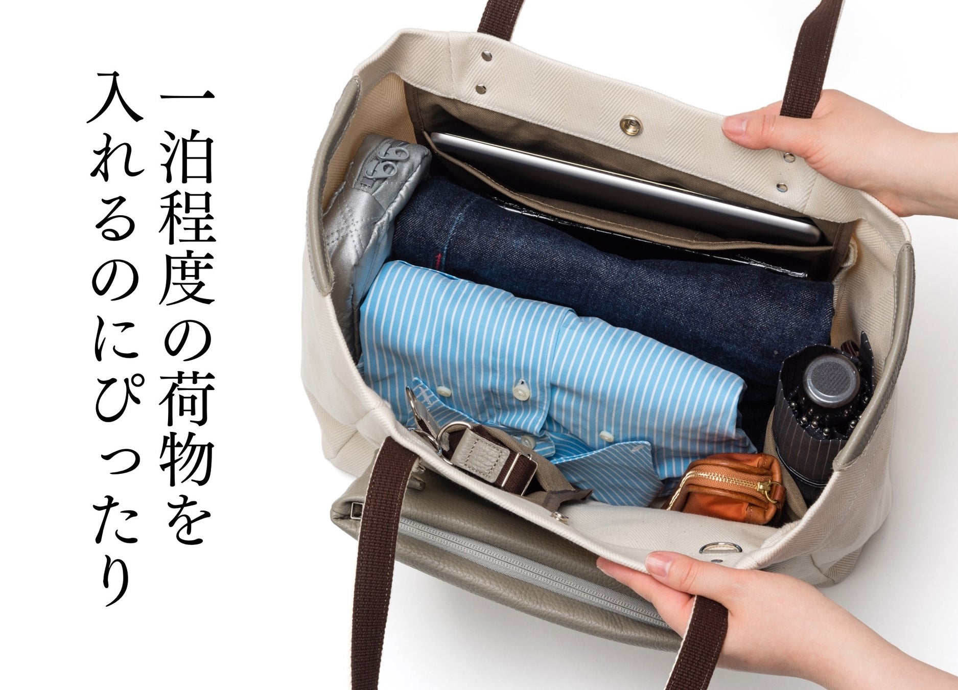 そこで、独自の“スライド式”ポケットを活用し、取り出しやすいだけでなくシーンによって使い分けられるトートバッグを開発!