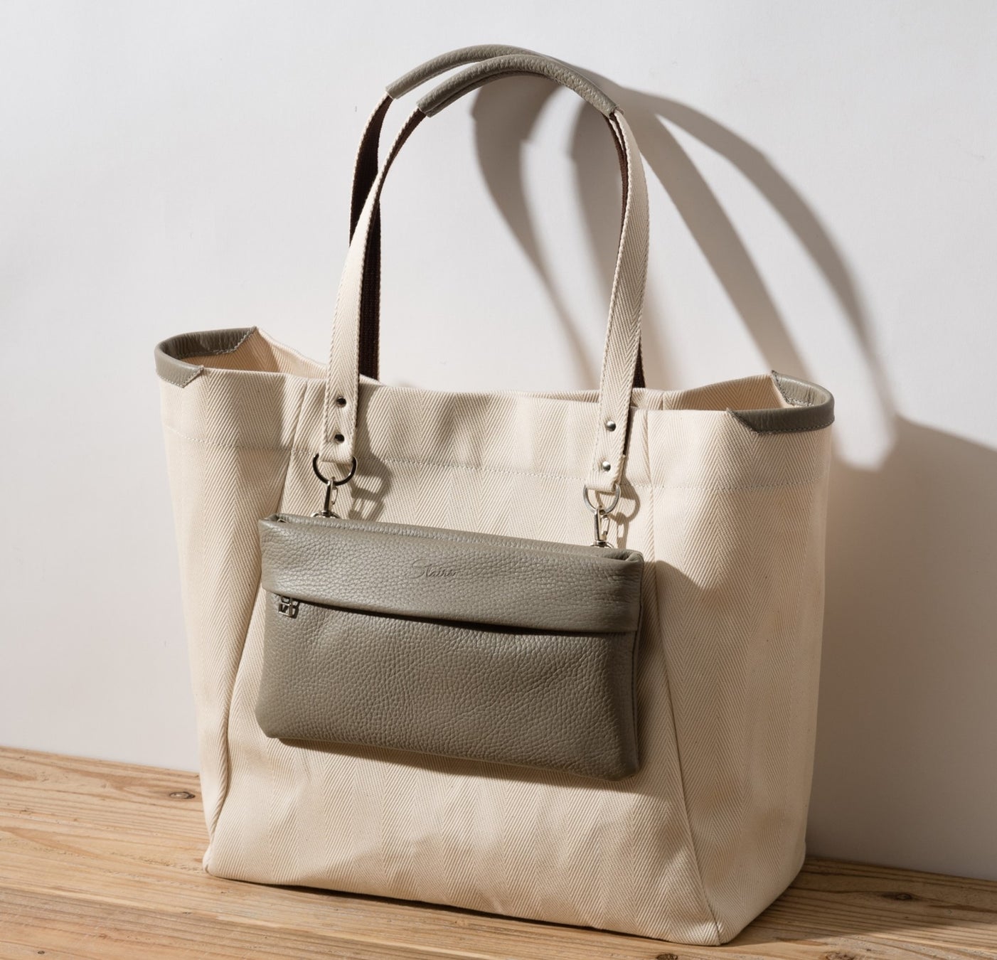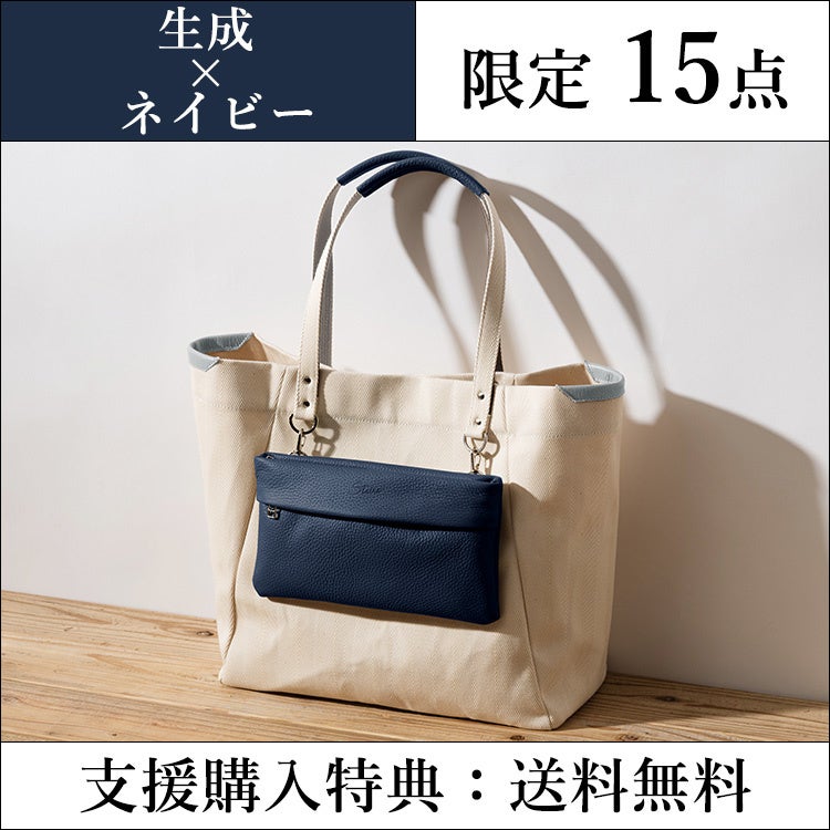 スライド式ポケットをあえて外付けすることで、トートバッグの容量はたっぷり確保!さらに、取り外してサコッシュとしても使える2way仕様にしたことで、身軽になりたいときも対応できるマルチなバッグが完成しました。