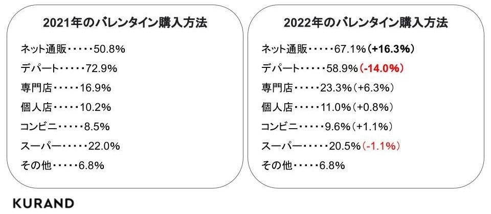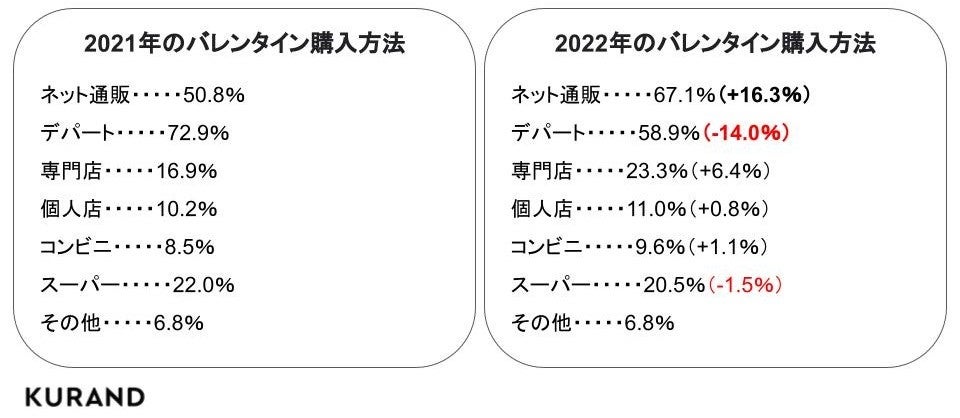 2021年と2022年のバレンタインの購入方法をそれぞれきいたところ、2021年は「デパート」と回答した72.9%が最も多かったのに対し、2022年は「ネット通販」と回答した67.1%が最も多くなったことがわかりました。