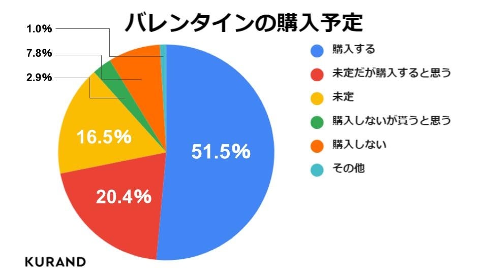 今年のバレンタインにチョコレートやギフトを「購入する」と回答したのが51.0%、「未定だが購入すると思う」と回答したのが20.6%で、合わせると約71%がバレンタインにチョコレートやギフトなどを購入すると回答していて、バレンタインへの関心が高いことがわかりました。