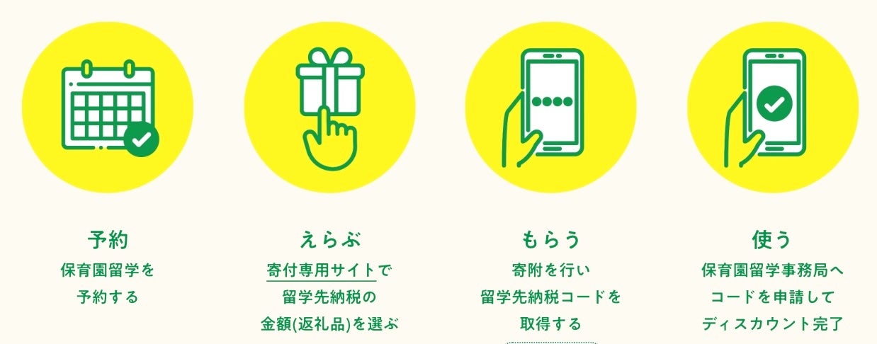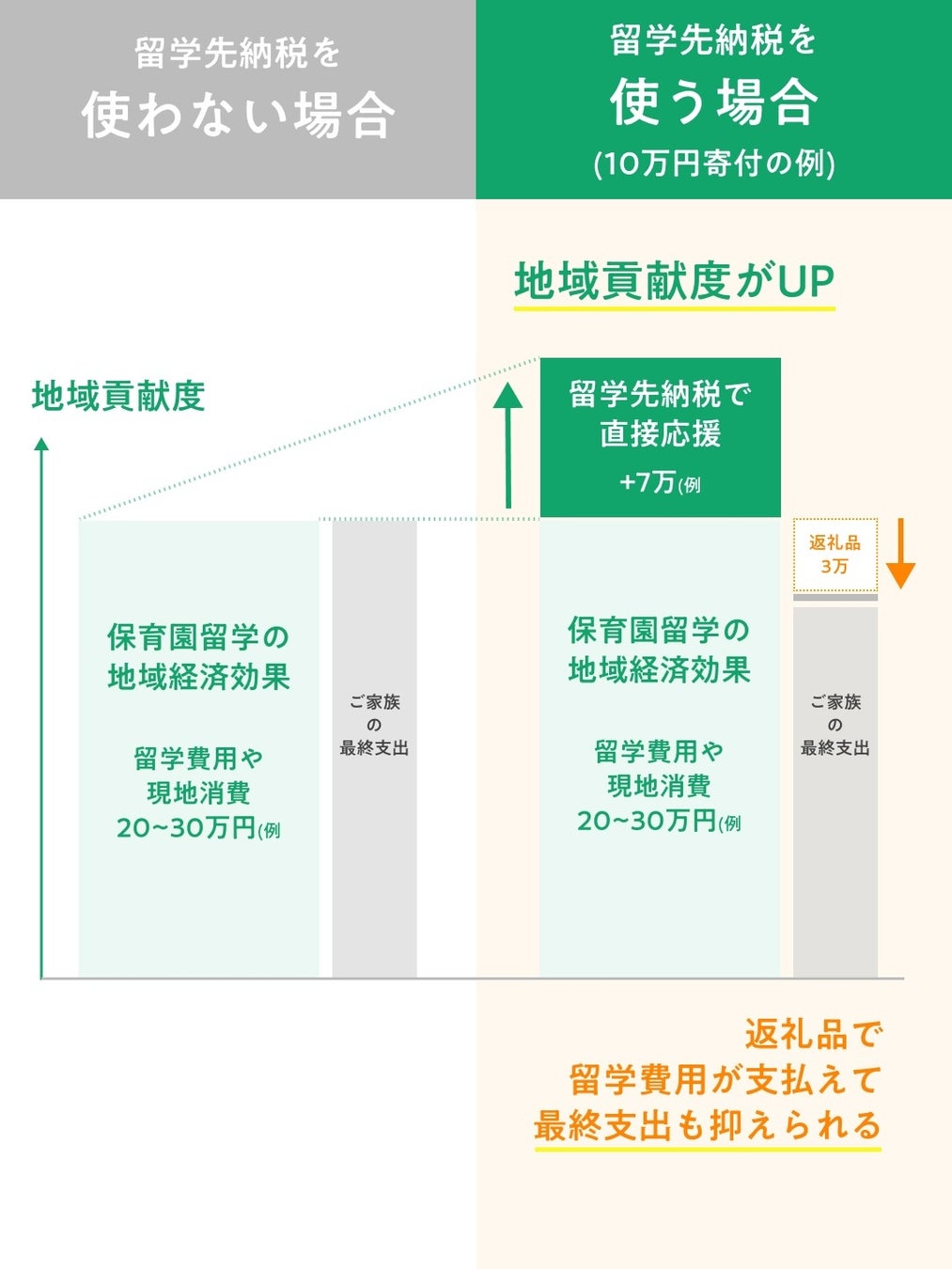 留学先納税®をすることで、「保育園留学に行く」という滞在と地域消費の貢献に加えて、さらにダイレクトに地域の応援をすることができます。ご家族にとっては、留学費用の最終支出も抑えながら、さらなる地域貢献につながります。