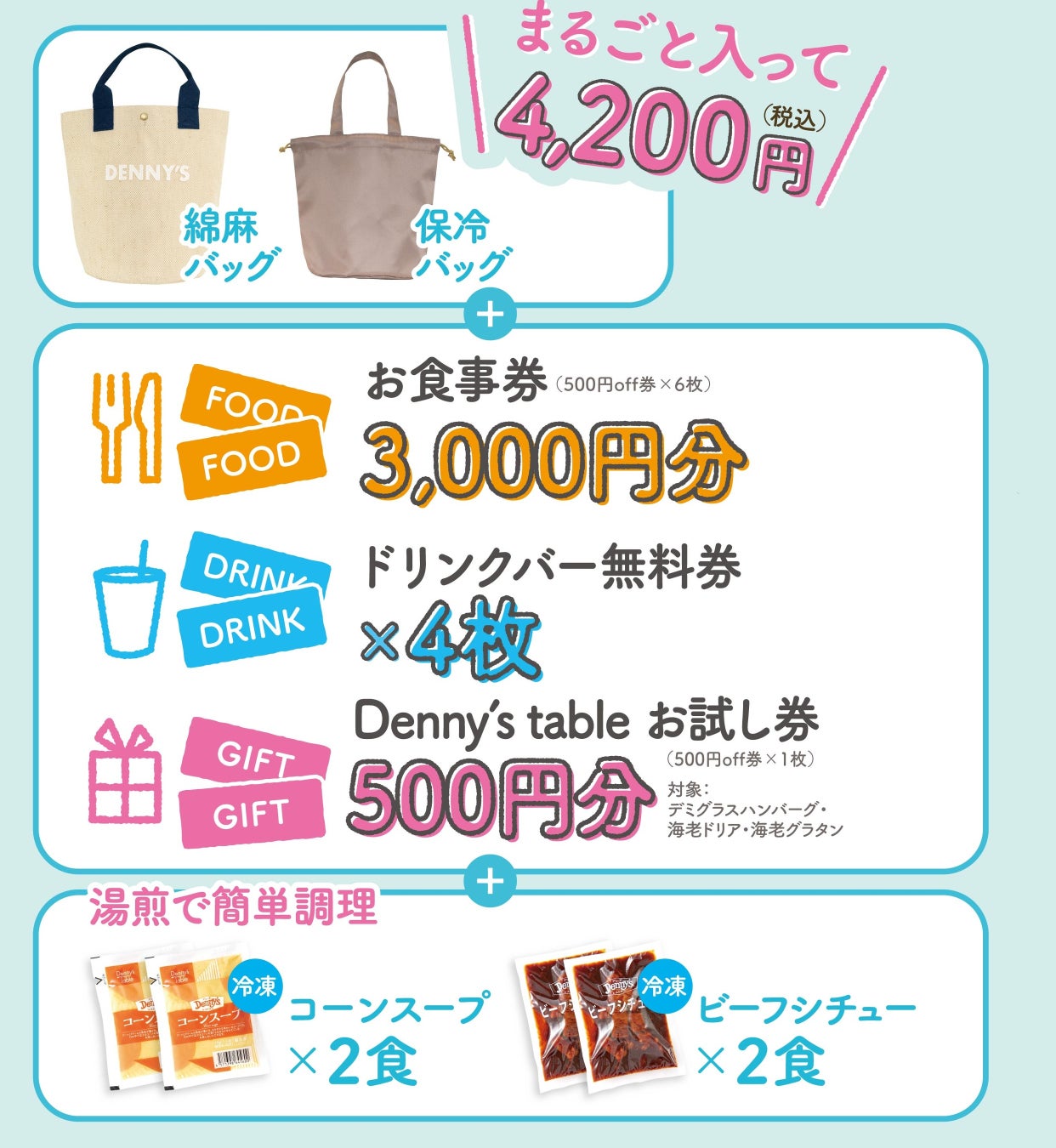 お得なクーポンがいっぱい!デニーズオリジナル「HAPPY BAG 2024」4月19日(金)~5月12日(日)期間限定販売