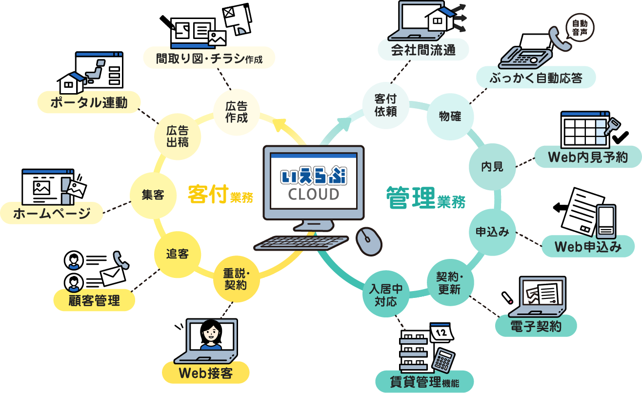 不動産業務支援に特化し、リーシング・賃貸管理システムから不動産会社のホームページ制作、顧客管理、専門コンサルティングまでサポートする、オールインワンのクラウドシステムです。不動産事業の業務を楽にし、コストカット・売上アップに貢献するサービスです。