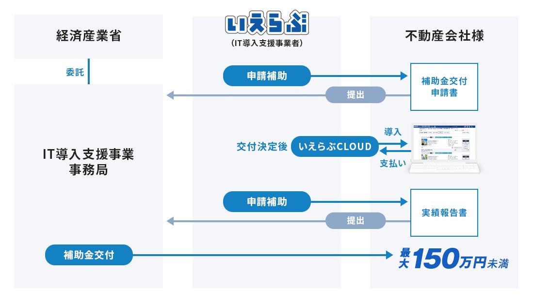 不動産事業者は、いえらぶCLOUDの導入時に最大150万円未満の補助金を利用することができます(交付には審査があります)。