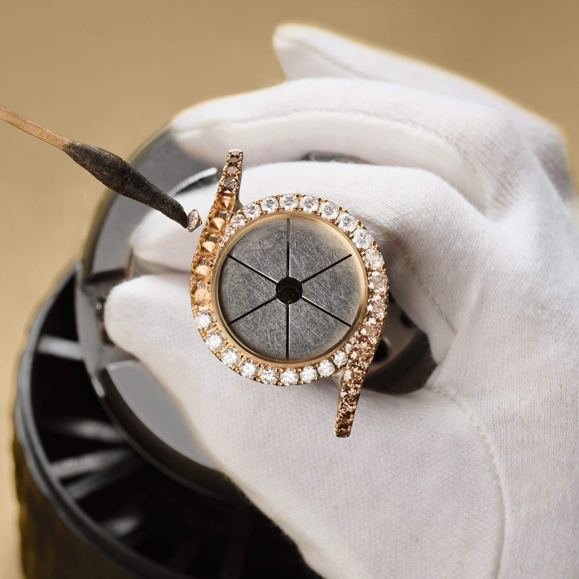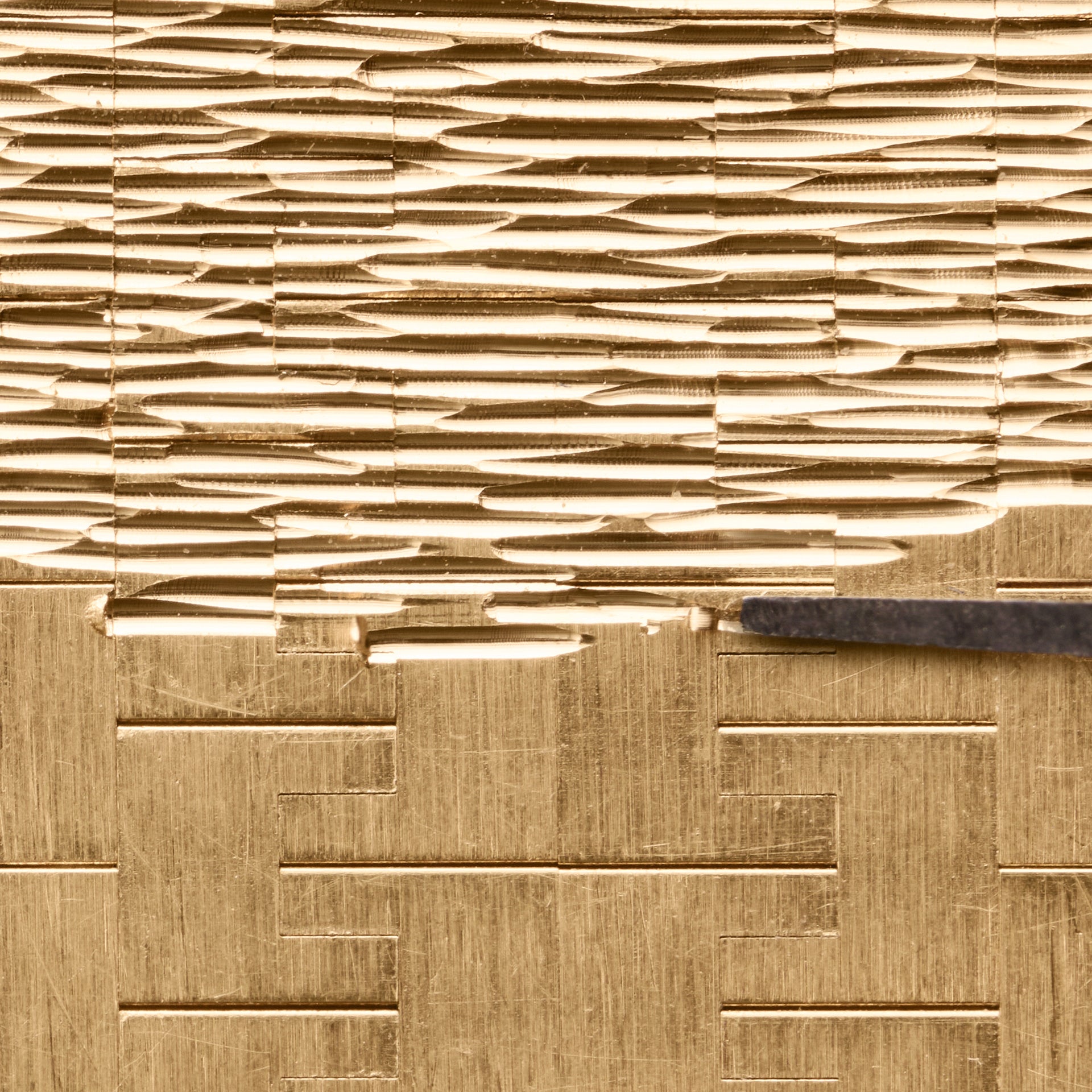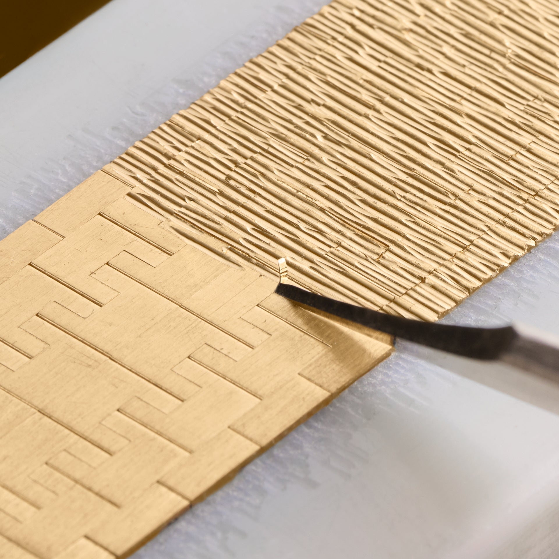 デコ パレス(パレス装飾)は 1961年に初めて開発され 、ピアジェが1969年に発表した「21st Century」の突出した特徴となりました。ギョーシェ彫りからインスピレーションを得た、質感のある表面は、滑らかに磨かれたゴールドという長年の伝統に挑戦し、貴金属を構造的な支持材から、表現力豊か、芸術的そしてスリリングな焦点へと変貌させました。手で自由に描く、流れるようなデコ パレス(パレス装飾)は、卓越した金細工の技術によってのみ実現できます。ビュランの鋭利な先端を使用して、手作業で一本一本の線や溝をゴールドに刻みます。リズミカルかつ思慮深さの求められる工程では、各動作の後、ゴールドの削りくずにそっと息を吹きかけて表面から取り除きます。デコ パレス(パレス装飾)の解釈は、それぞれが唯一無二であり、金細工職人一人ひとりが独自の技法を持ち、異なる圧力、異なる角度、異なる速度、異なる動作で、個性的な芸術作品を作り上げているからです。これは、ピアジェが職人への献身と、人の手作業の重要性を浮き彫りにしています。