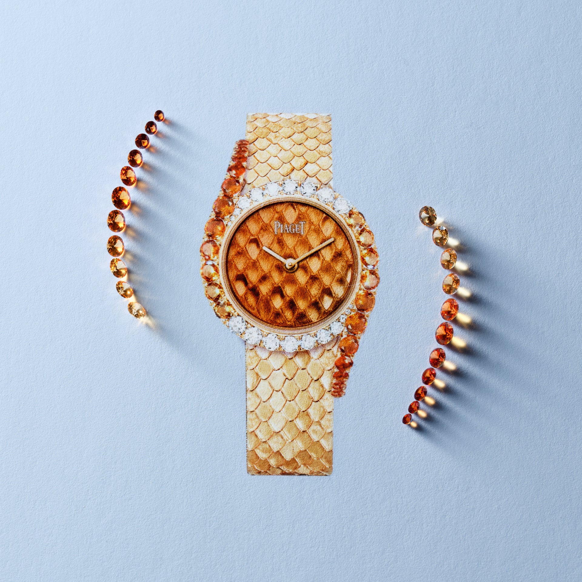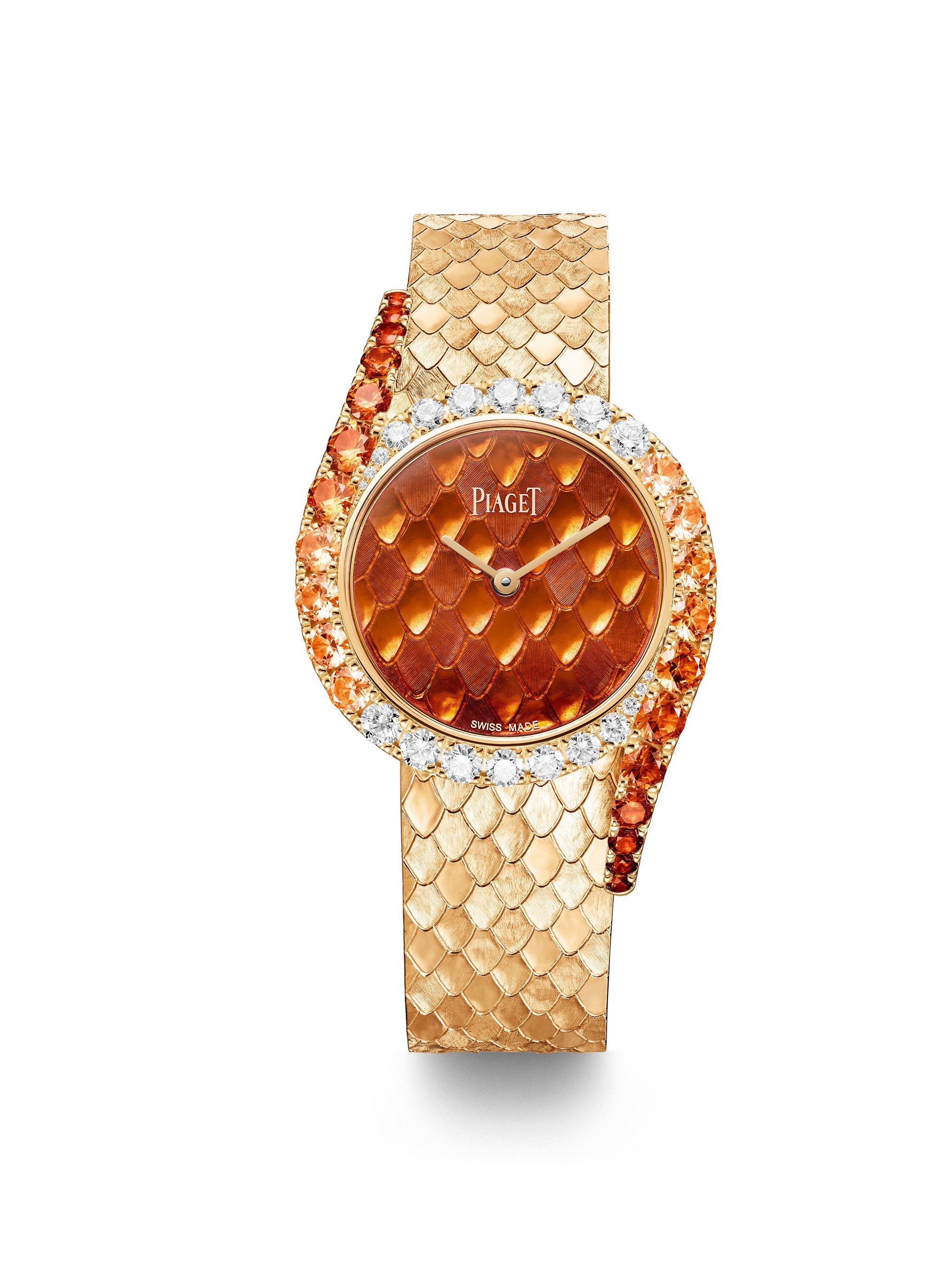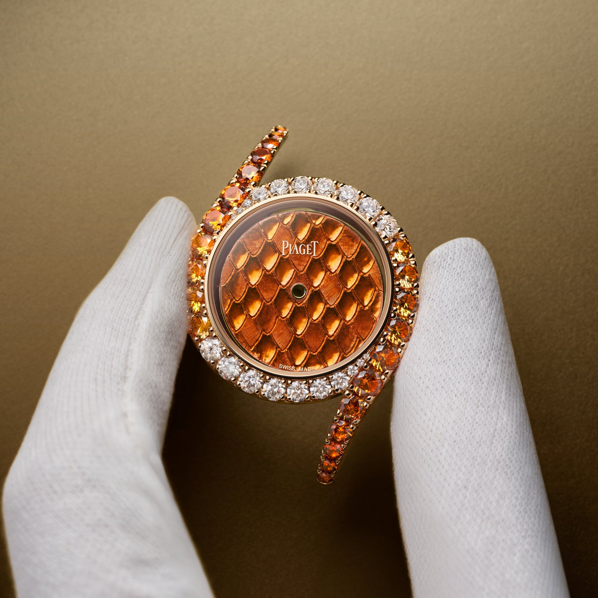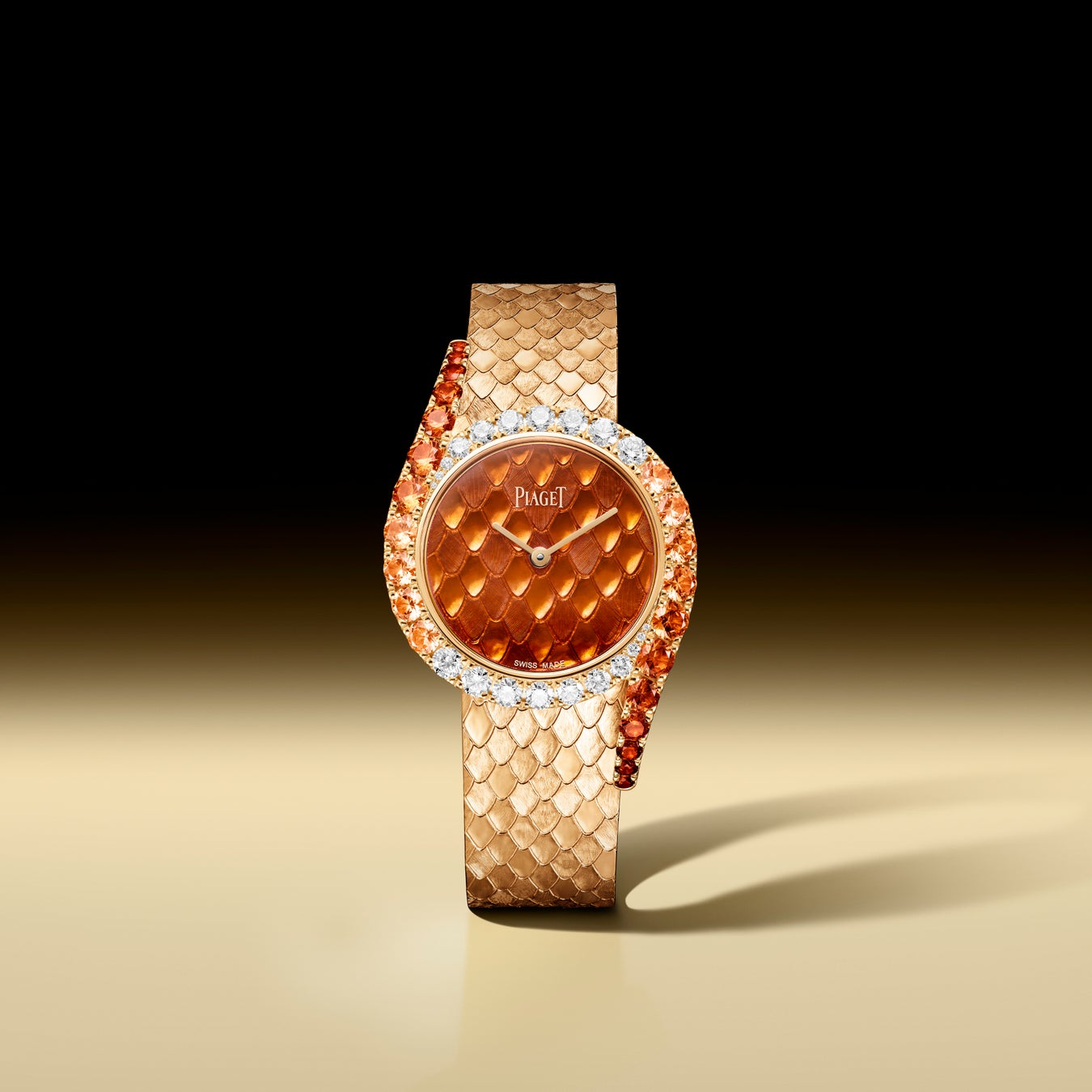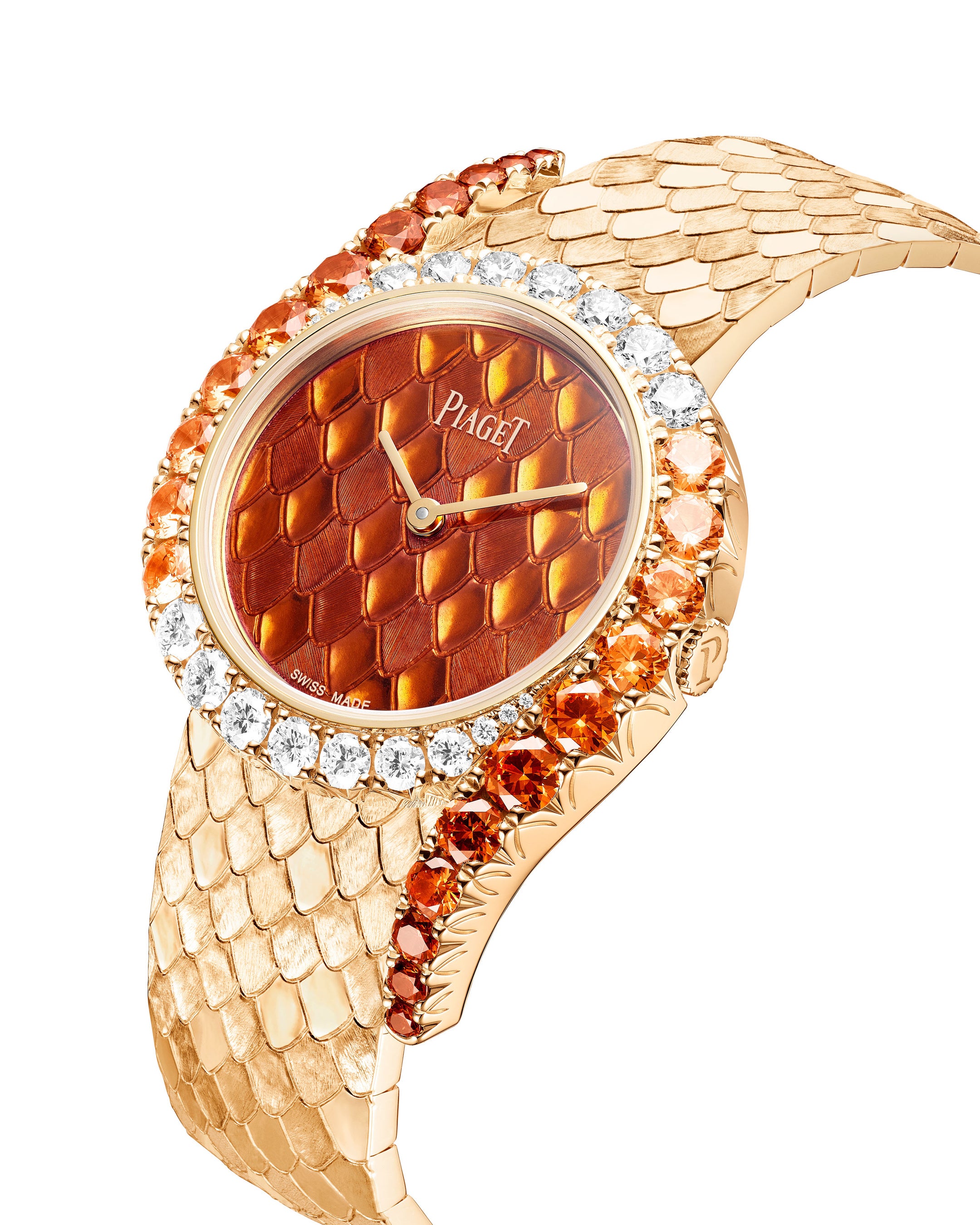 2026年春、ピアジェは2つの新しいライムライト ガラ モデルを発表します。脚光を浴びたがっているような、炎の色調が映えるタイムピースです。スネークパターンのゴールドエングレービングに鮮やかなオレンジ色の「グラン・フ」エナメルを施した文字盤。贅沢にあしらったダイヤモンドがサーキュラーケースを囲み、スネークパターンのゴールドエングレービングを施したブレスレットに向かって、スペサタイトガーネットの濃い夕焼けの陰影が曲線を描きながら流れています。2019年、Extremely Lady ウォッチに導入されたこの特殊に凝ったエングレービング技法は、極めて高い技術と専門知識を必要とし、ハウス・オブ・ゴールドに献身する職人へのオマージュを捧げています。奥行きと質感のトロンプルイユ効果は、爬虫類のしなやかで波打つ鱗を模倣しています。