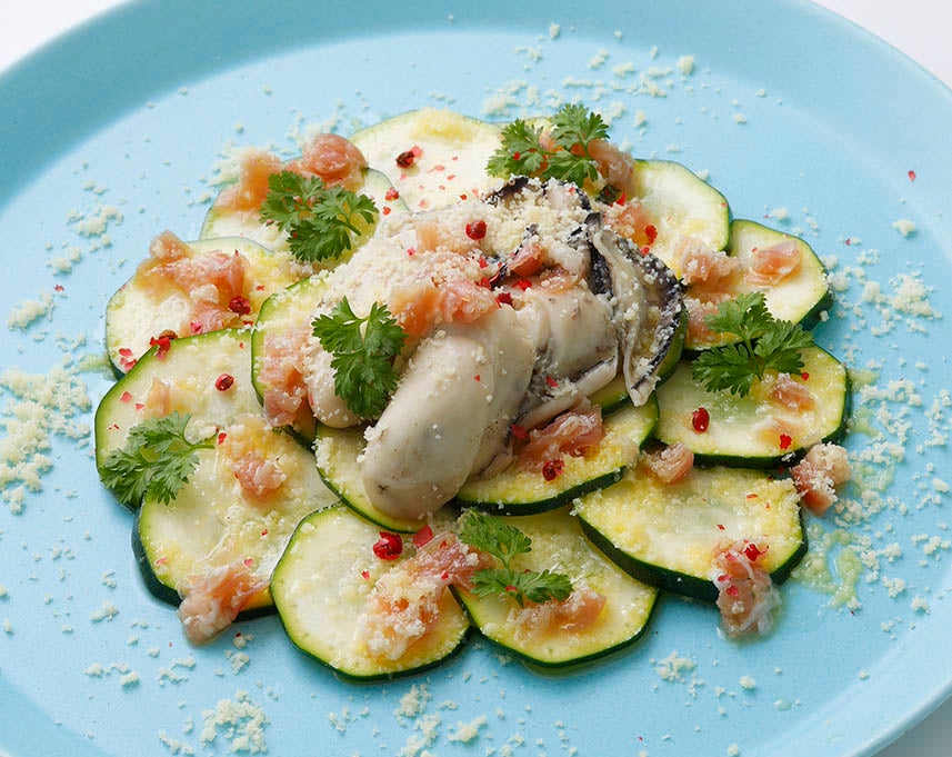 軽くボイルした生牡蠣と、季節の野菜をカルパッチョに。ほんの少し加熱した牡蠣は、生とはまた違う食感と味わい。生ハムとビネガーソースがよく合います。