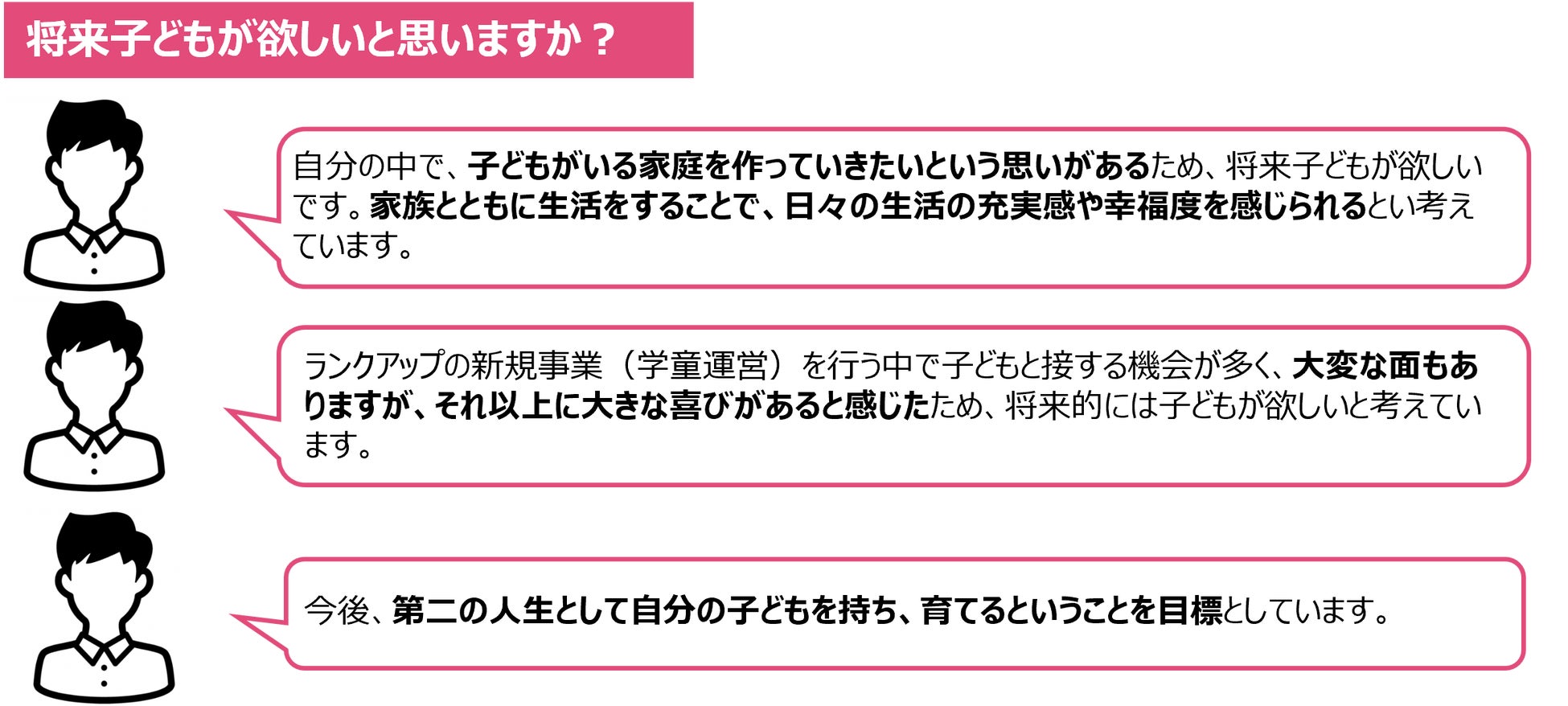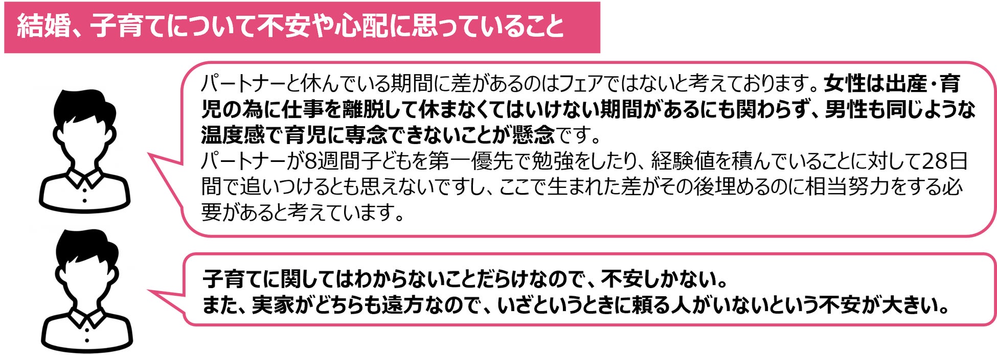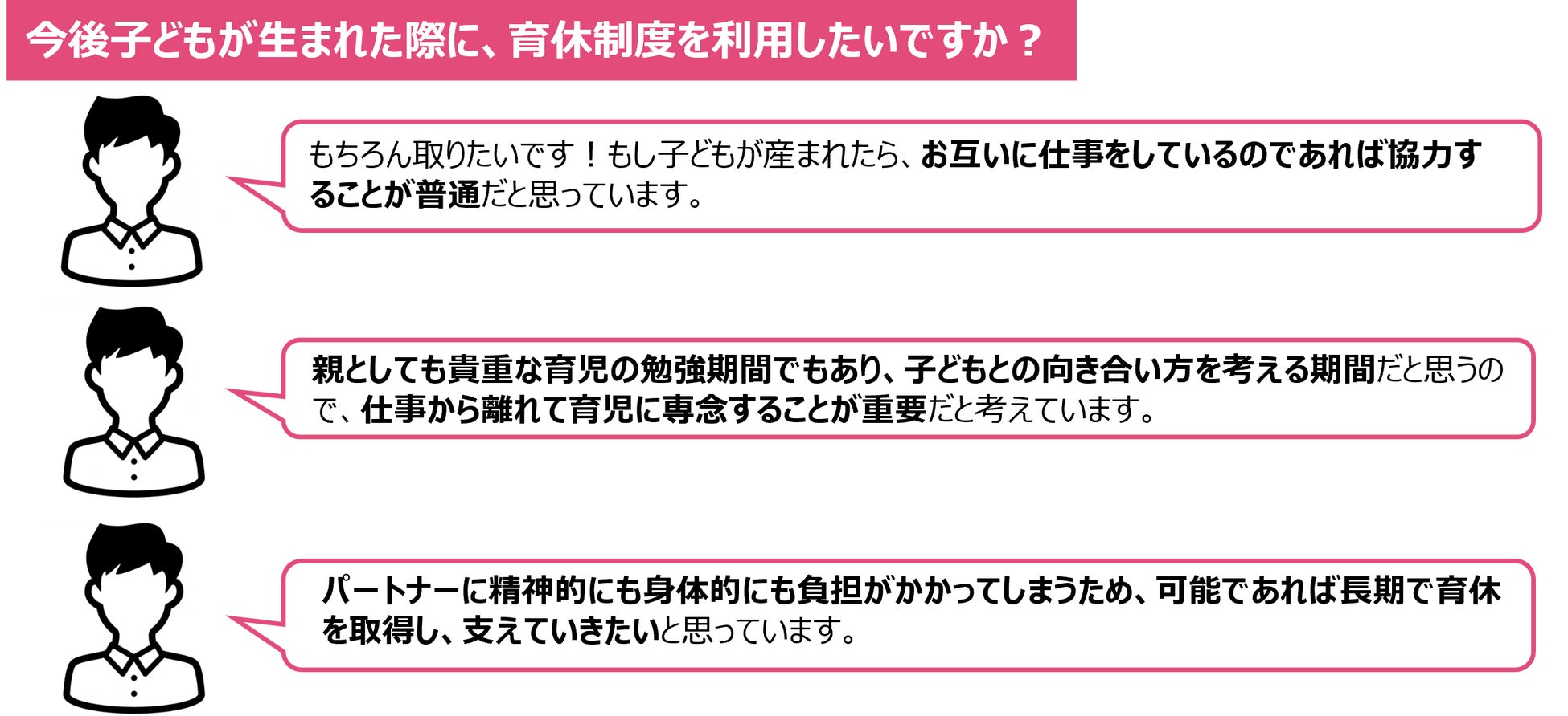 将来的に子どもを望む声は多く、「日々の生活の充実感や幸福度を感じられる」、「大きな喜びがある」など、人生をより豊かにしたいことが理由として挙げられていました。また、育休制度の利用に対しても前向きな意見が多く、子どもと多くの時間を過ごしたい、パートナーとともに育児をしていきたいという姿勢が伺えます。