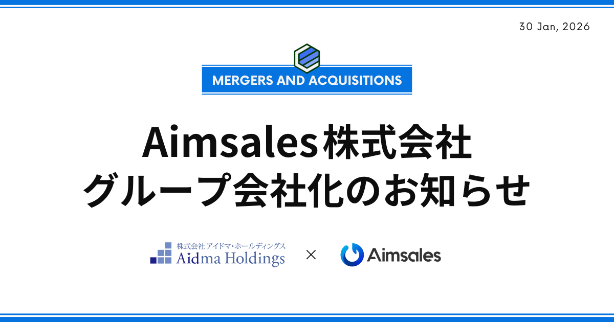 株式会社アイドマ・ホールディングス(本社:東京都品川区、代表取締役:三浦 陽平、以下、アイドマHD)は、AIを活用した全自動営業ツール「Aimsales」を開発・提供するAimsales株式会社(本社:東京都渋谷区、代表取締役:根路銘 啓、以下、Aimsales社)の全株式を取得し、2026年1月30日付で同社をグループ会社化しましたのでお知らせします。本件により、Aimsales社の代表である根路銘 啓氏も当社グループに参画し、当社の開発体制およびプロダクト開発力のさらなる強化を図ります。