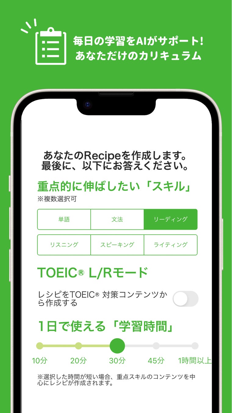 現在、200万人が「レシピー」で英語学習しています。この200万人の学習データをAIで解析したうえで、学習者の「英語スキル」「強化したいスキル」、さらに「1日の学習時間」を基に、個別最適化された「日々の学習カリキュラム」をAIが自動で生成します。