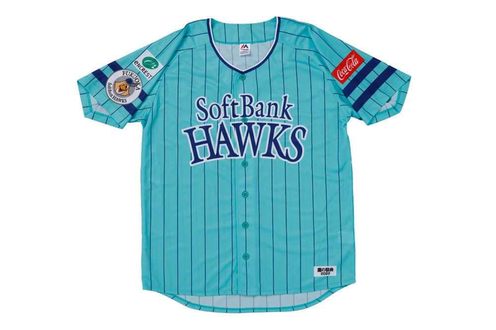 選手たちの勝負の表情とともに、中央の「勝」の文字は今年4月に行われた鷹の祭典2023ユニフォーム発表会見の際に書道パフォーマンスを披露した福岡県立大牟田北高等学校書道部によりしたためられた文字が使用されています。「再生」と「幸運」を意味するエメラルドをベースに、勝利に向かって突き進むエネルギッシュなデザインにまとめ上げました。