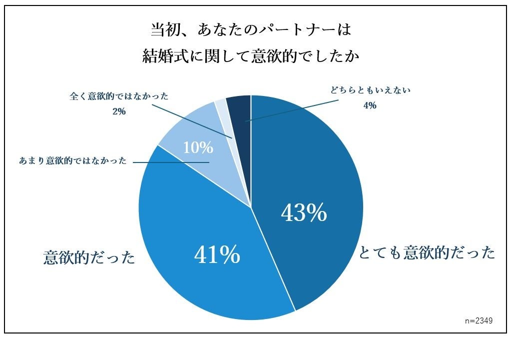 パートナーが意欲的ではないというケースもしばしばあります。『あなたのパートナーは結婚式に関して意欲的でしたか』の質問に対して、84%の方が「とても意欲的だった」「意欲的だった」と回答した一方、「あまり意欲的ではなかった」「全く意欲的ではなかった」との回答は12%でした。パートナーが意欲的ではなかった方に、『あなたのパートナーは挙式後、結婚式を挙げて良かったと感じていましたか』と質問したところ、93%の方が「とても感じていた」「感じていた」と回答しました。挙式前のモチベーションを問わず、9割超の方が結婚式を挙げて良かったと感じています。