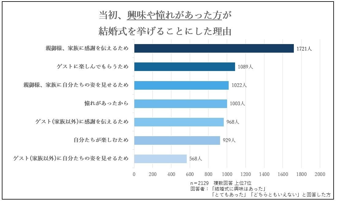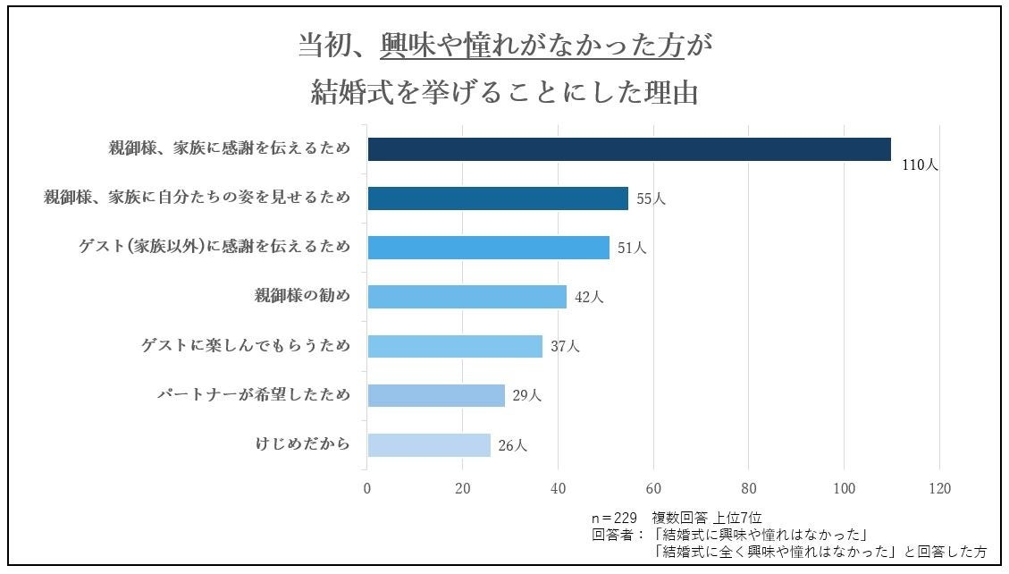 結婚式に対しての興味や憧れが『なかった』『全くなかった』と回答した方が結婚式を挙げた理由は、「親御様、家族に感謝を伝えるため」が最も多く、「親御様、家族に自分たちの姿を見せるため」が続きました。また、興味や憧れがあった方の回答では上位7位に入らない「親御様の勧め」「パートナーが希望したため」「けじめだから」が入ることから、結婚式を通してゲストを喜ばせることや自分たちが楽しむことよりも、結婚式を挙げること自体を目的にしている方が多いと考えます。