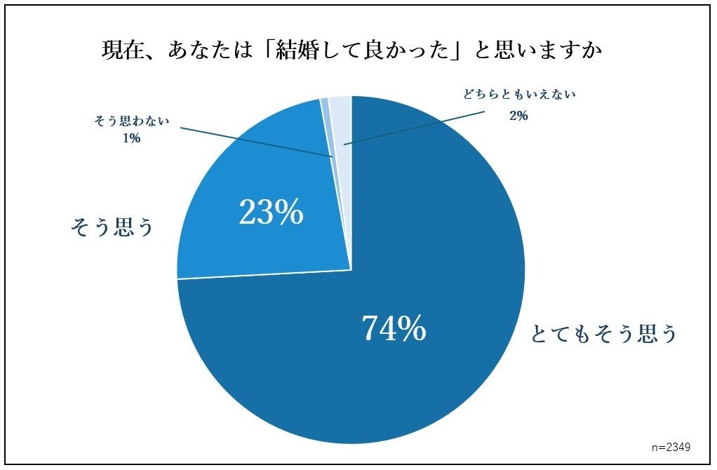 結婚に対する満足度についても調査しました。『結婚して良かったと思いますか』という質問に対し、74%の方が「とてもそう思う」、23%の方が「そう思う」と回答。