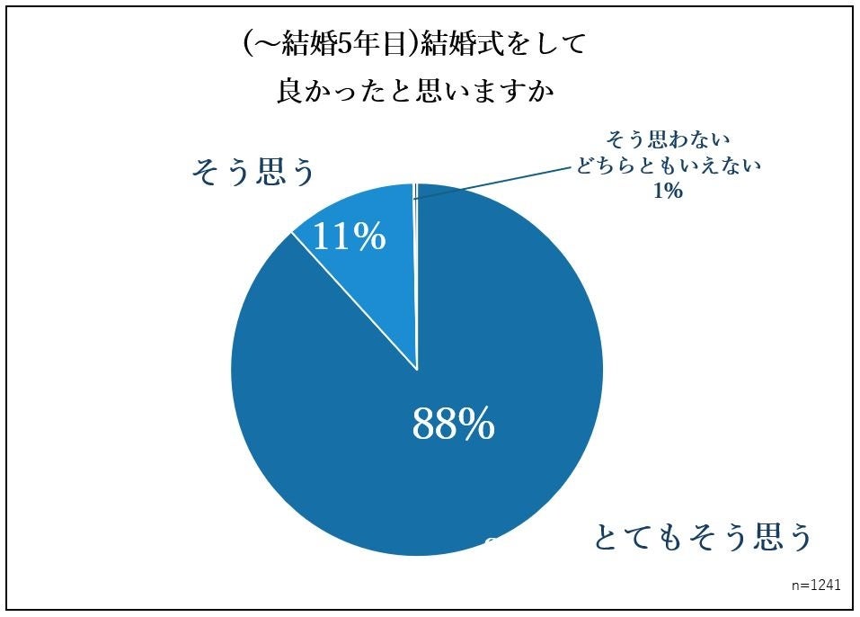 昨今、結婚式に興味のないカップルは増えていますが、『結婚式を挙げる前から、結婚式に興味や憧れはありましたか』に対して、「とてもあった」「あった」と回答した挙式後5年目までのカップルは88%で、全体の87%とほぼ同水準でした。『結婚式をして良かったと思いますか』という問いにも全体の結果同様99%が「とても良かった」「良かった」と答え、直近5年間とそれ以前で結婚式に対する興味や、実施に対する満足度にほぼ変化はありませんでした。