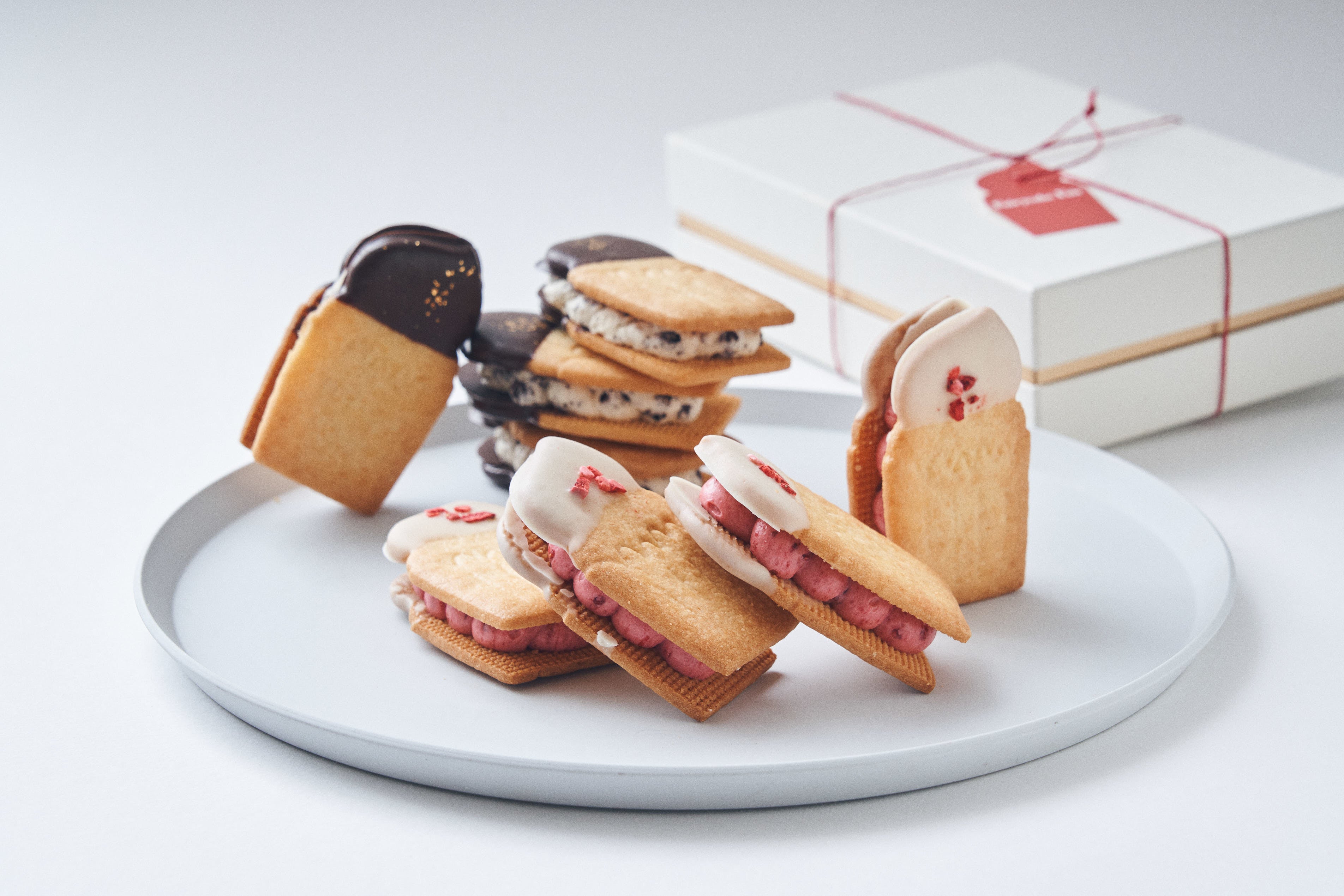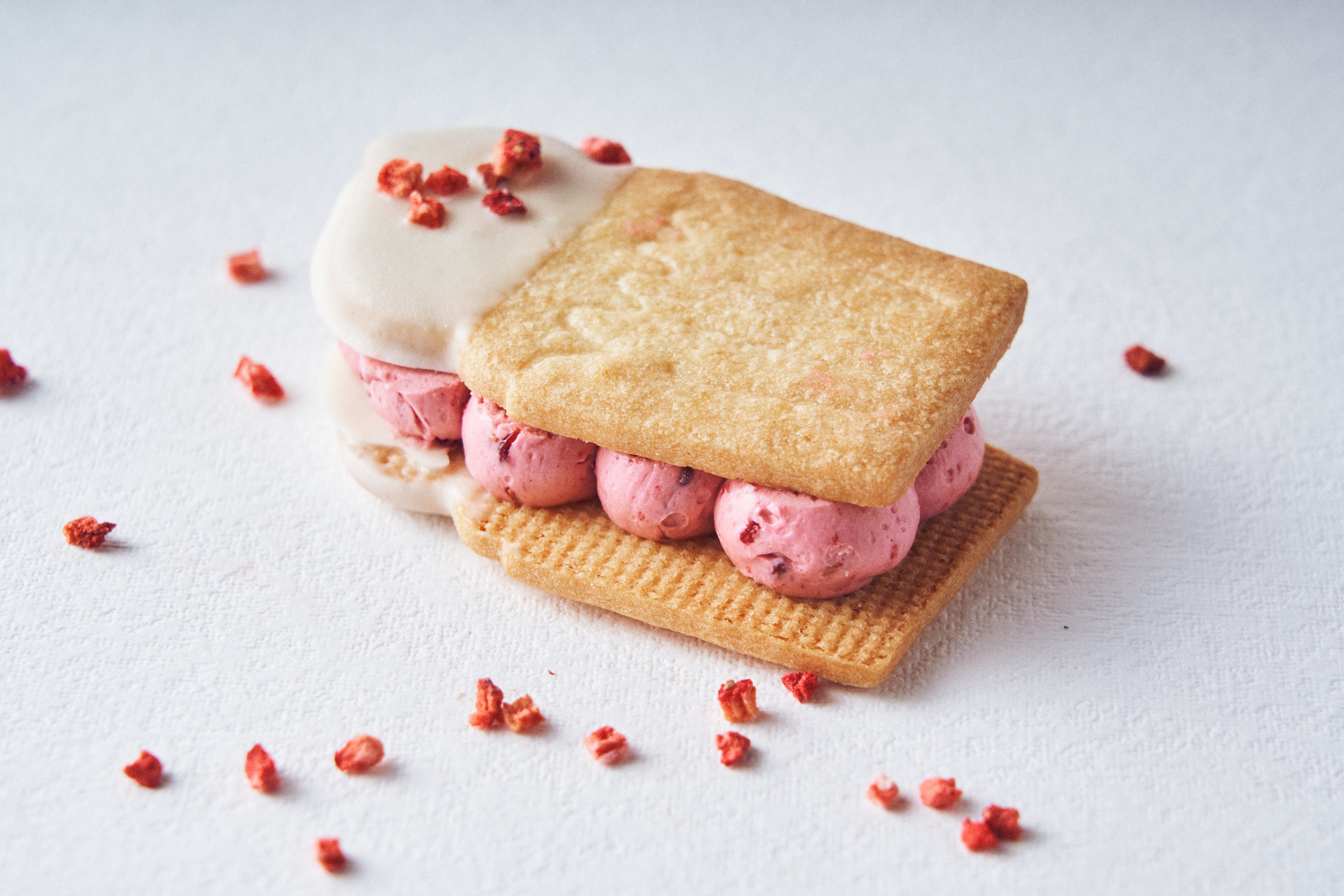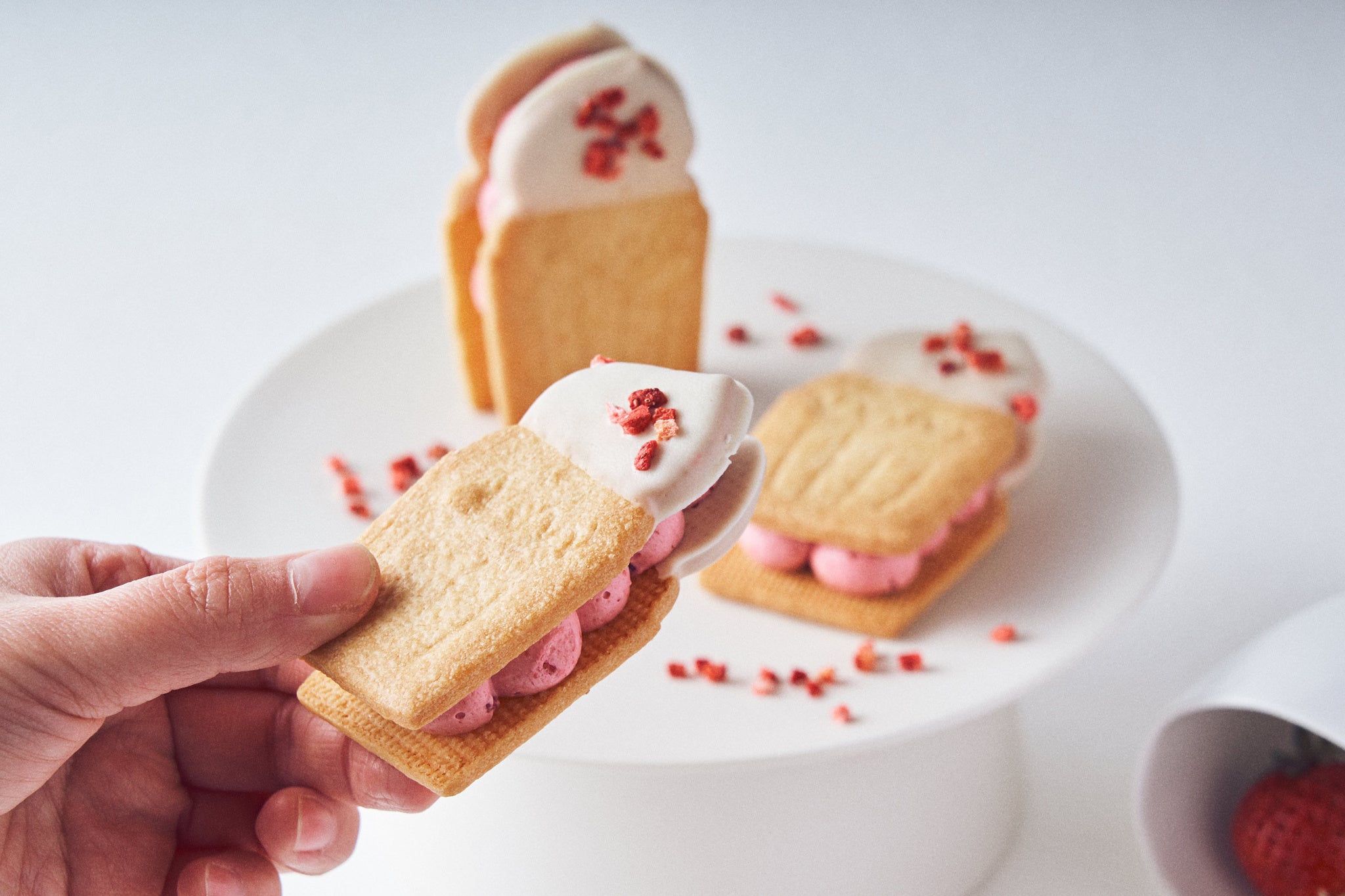 程よい酸味で甘くひときわジューシー。三拍子のバランスが揃う最高品質のいちご〈あすかルビー〉と、つぶつぶ食感がクセになる甘酸っぱいラズベリーをまるごと煮込んだ自家製ジャムに、ホイップしたフレッシュバターを合わせ、果実感たっぷりの瑞々しい特製“ジャム生バタークリーム”が完成しました。ホワイトチョコレートがけした焼きたてのビスケットへ1つ1つ丁寧にクリームを絞ってサンドし、いちごのフリーズドライをトッピング。春めいた爽やかな甘みが広がる、味も見た目も華やかないちごのお菓子です。
