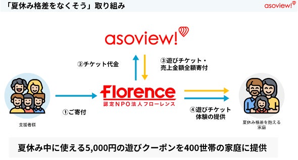 当社ではフローレンスに集まったご寄付を原資とし、「アソビュー!」にて夏休み期間中に使用できる5,000円分のクーポンチケットを発行し、合計約400世帯の家庭に対しご提供します。