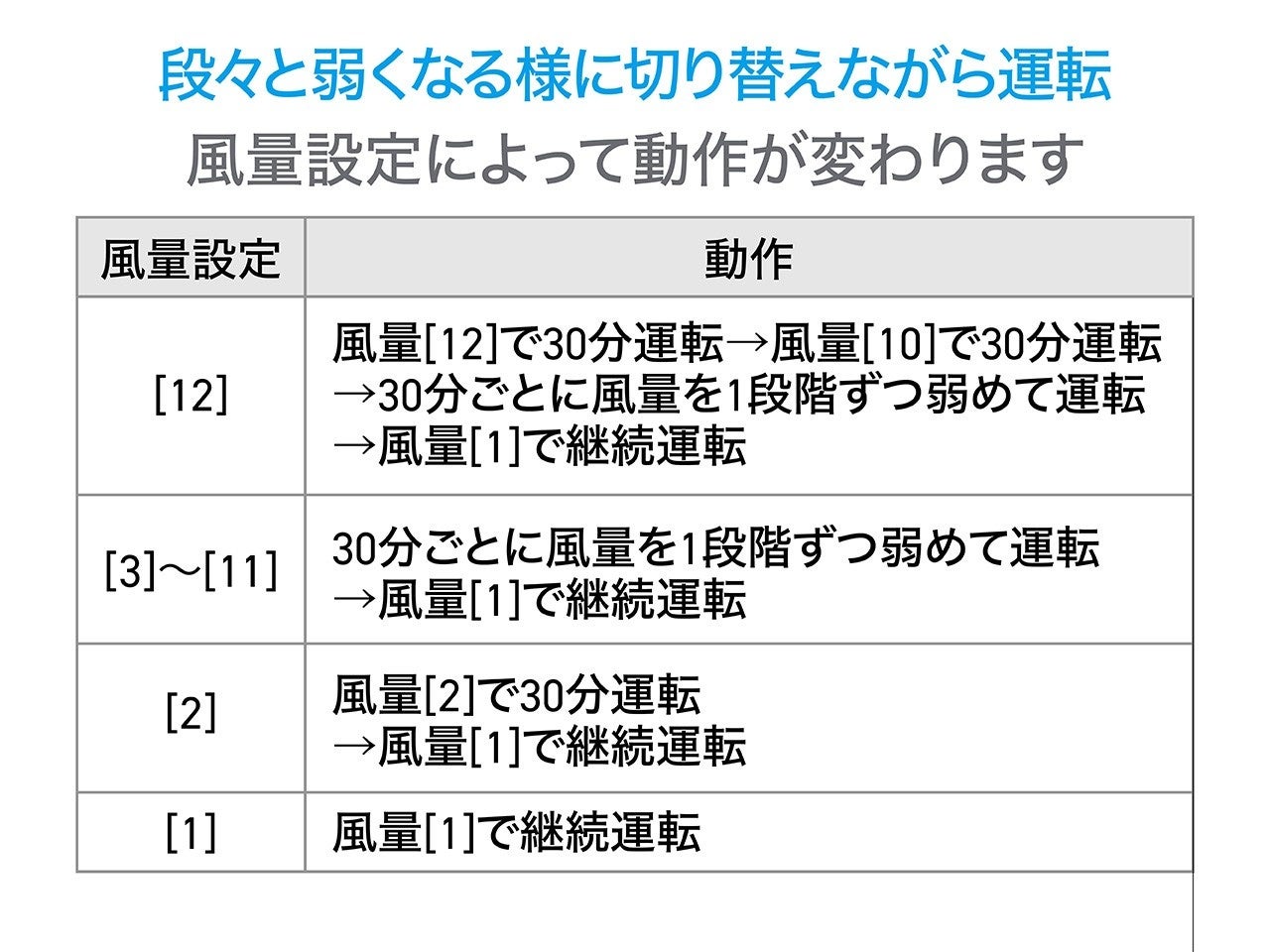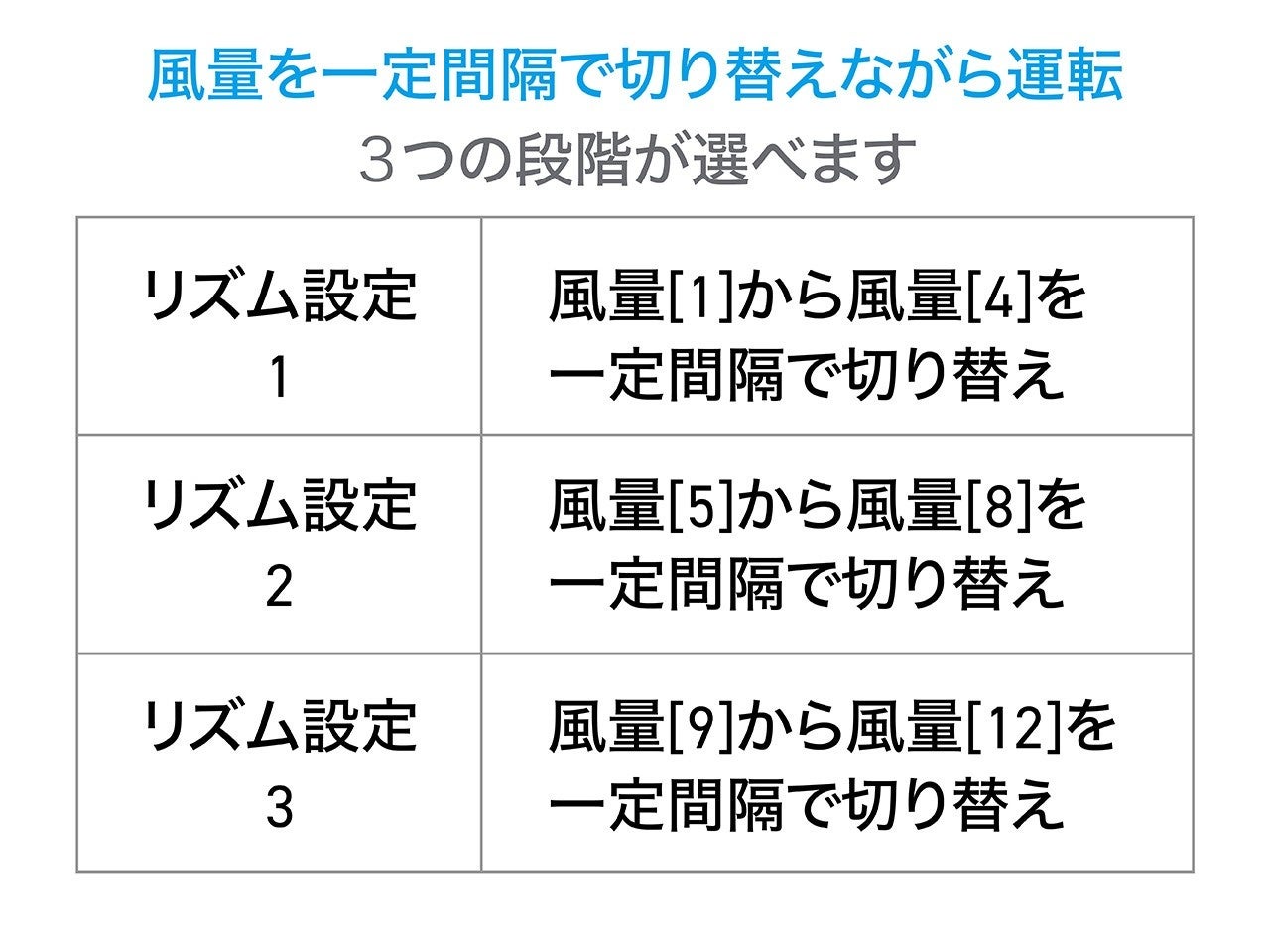 ・2種類のモード搭載でシーンに合わせてお好みの風が選べる。一定間隔で風の強弱をコントロールする「リズムモード」、段々と風量を弱くしていく「おやすみモード」。